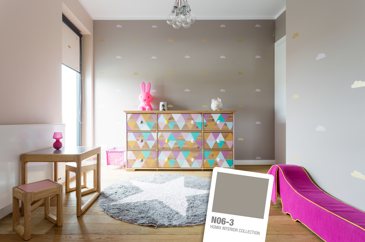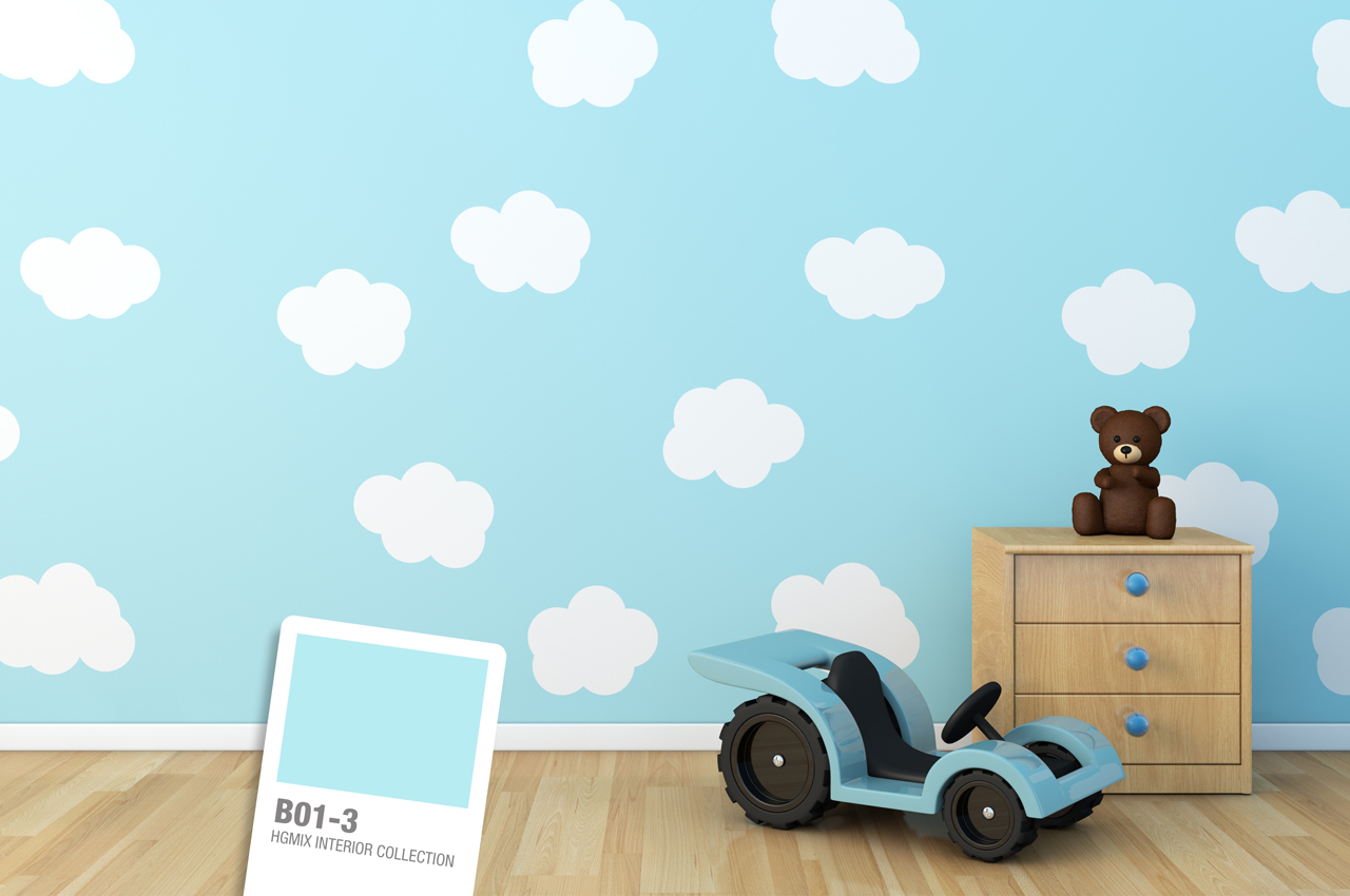 Če vam po pleskanju otroške sobe ostane še kaj energije in ustvarjalnega veselja, lahko skupaj z otrokom na stene narišete, na primer oblačke. Le-ti so zelo popularni, hkrati pa so enostavni za risanje, saj so nepravilnih oblik in vsak oblaček bo pravi. Beli oblački močno pridejo do izraza na barvnih niansah B01-3 in N06-3.