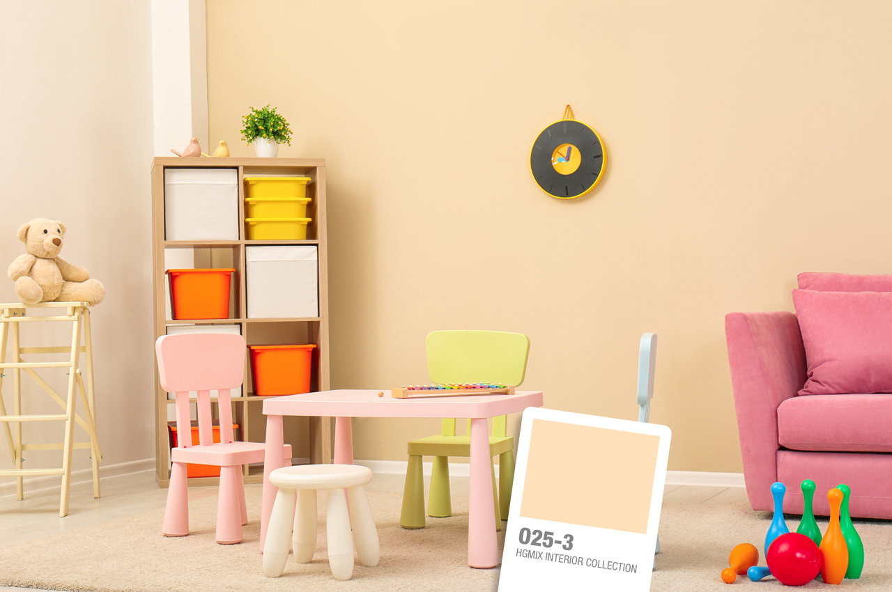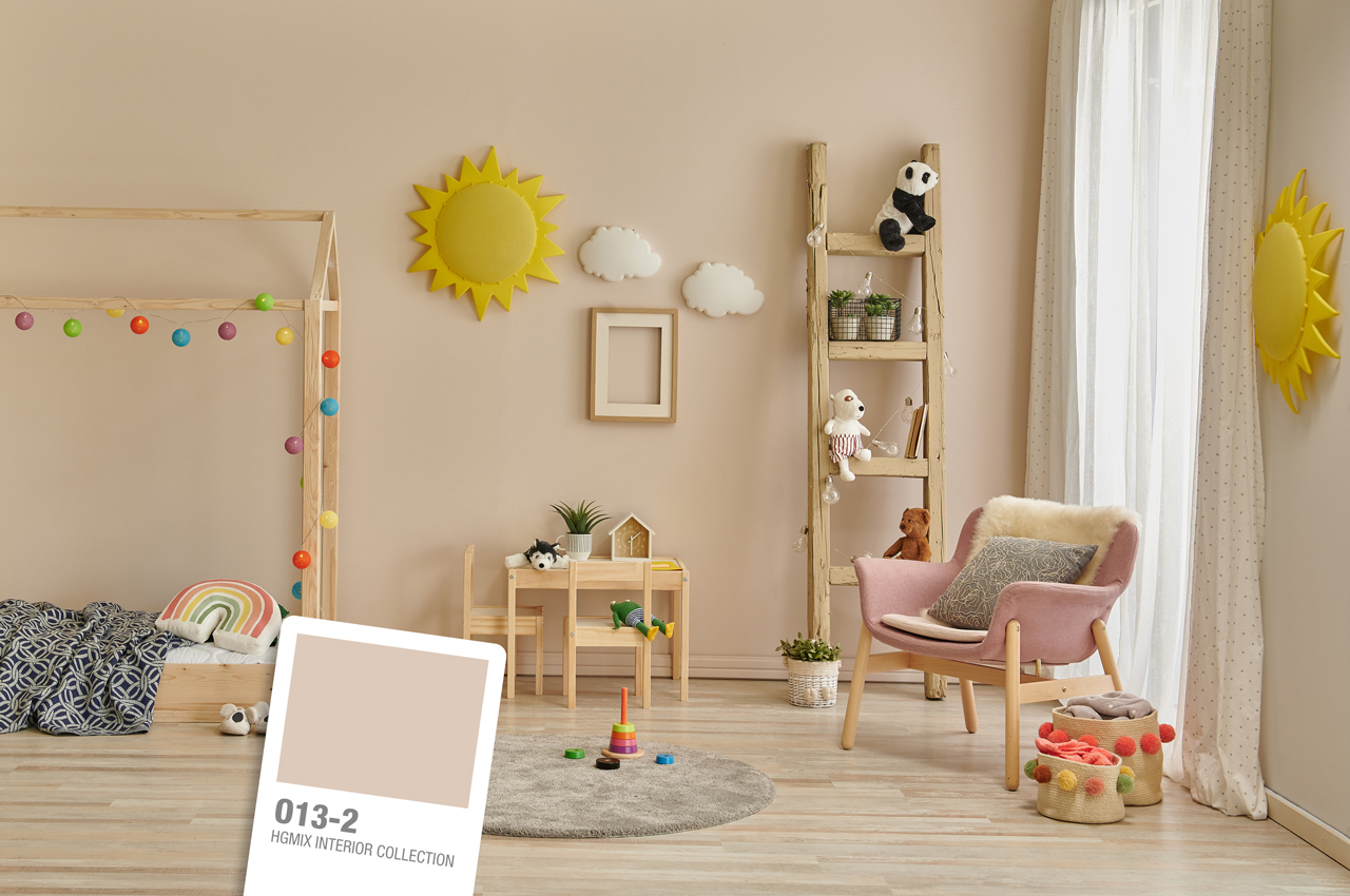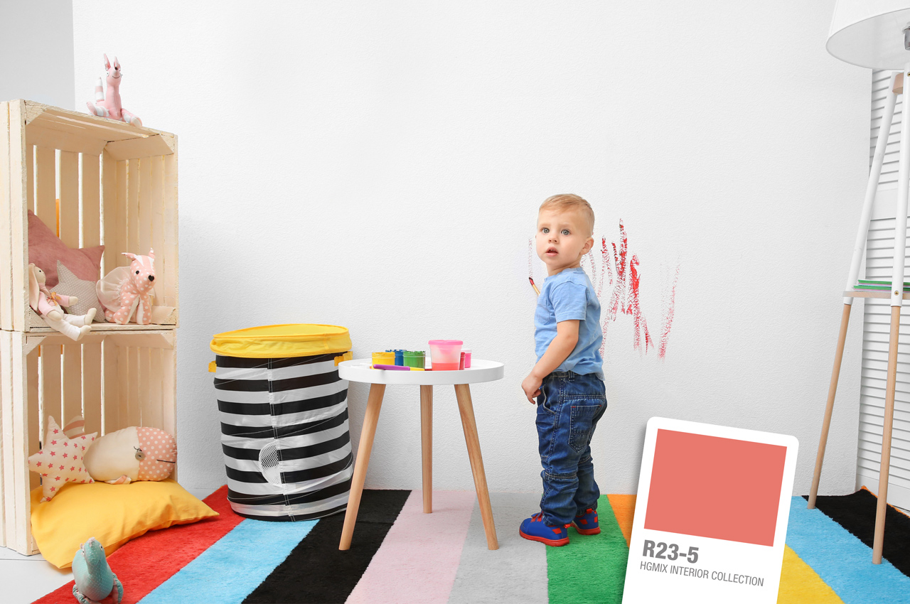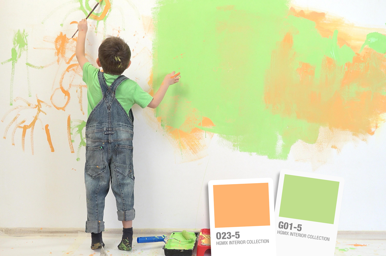 Če ste bolj sproščene narave, mu lahko določite del stene, na katero lahko čisto sam "nariše" svojo stensko sliko, lahko pa svojemu otroku pustite, da postane vaš pleskarski pomočnik. Na hitro mu predstavite čopič ali valjček, nato pa mu pustite "ustvarjati" na steni, ki jo boste kasneje lahko sami prebarvali. Ali pa naj s čopičem barvajo steno tik ob vas medtem, ko vi pleskate v valjčkom. Ne boste verjeli, koliko časa barvanje drži otroško pozornost. Ta hip sta za otroško sobo zelo priljubljeni barvi O25-3 in O13-2.