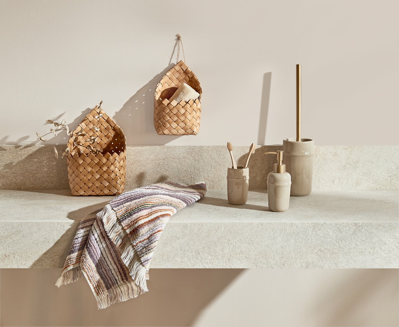 Če potrebujemo več prostora za shranjevanje, lahko na stene enostavno obesimo viseče pletene košare iz lesa s FSC certifikatom (FSC® N001715). Uporabljamo jih lahko za shranjevanje kozmetike ali brisač, kot so bombažne brisače, pobarvane s prejo, narejene iz 30 % recikliranega bombaža, in shranimo toaletni papir v košari za toaletni papir iz morske trave.
