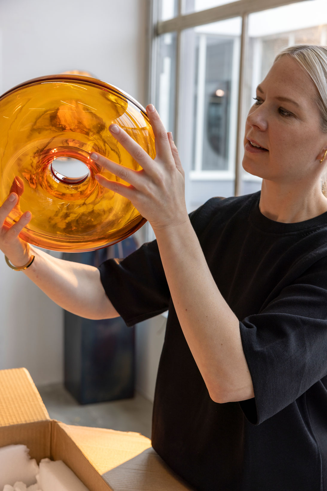 »Ko svetloba prehaja skozi oranžno steklo, mehka oblika zaobljenega geometrijskega lika zasije s toplim sijajem«, pravi Sabine Marcelis. »To je čaroben prizor, ki ujame pogled – ne glede na to, ali je postavljena na mizi ali visi na steni«, še doda.