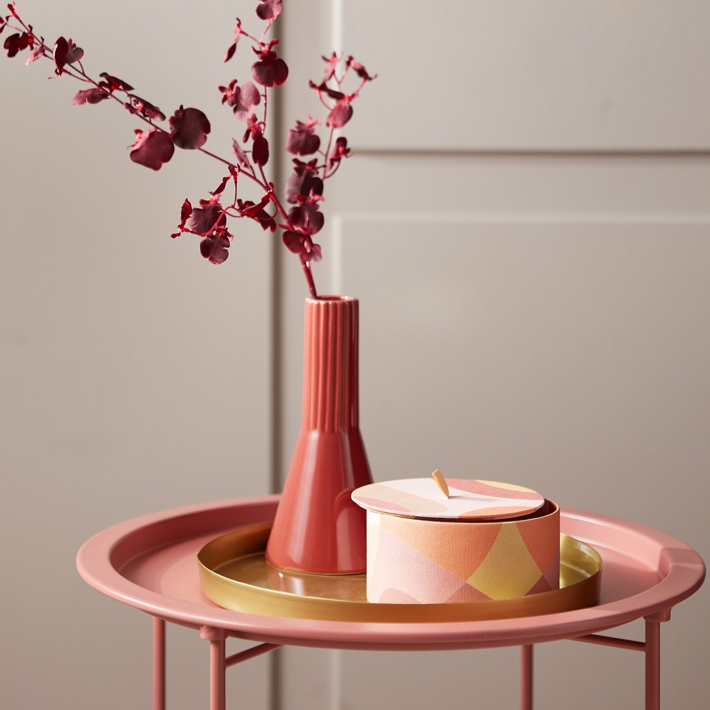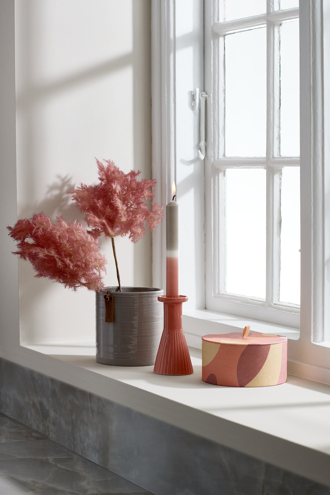 Zabava je v ženstvenih barvah in je prisotna skozi nekaj elementov te kolekcije, kot je recimo vaza iz ročno pihanega stekla, katere pastelne barve se prepletajo, zato je vsak primerek edinstven. Šopku pisanega umetnega cvetja, omarici zanimivega in nekoliko retro dizajna, keramičnemu svečniku.