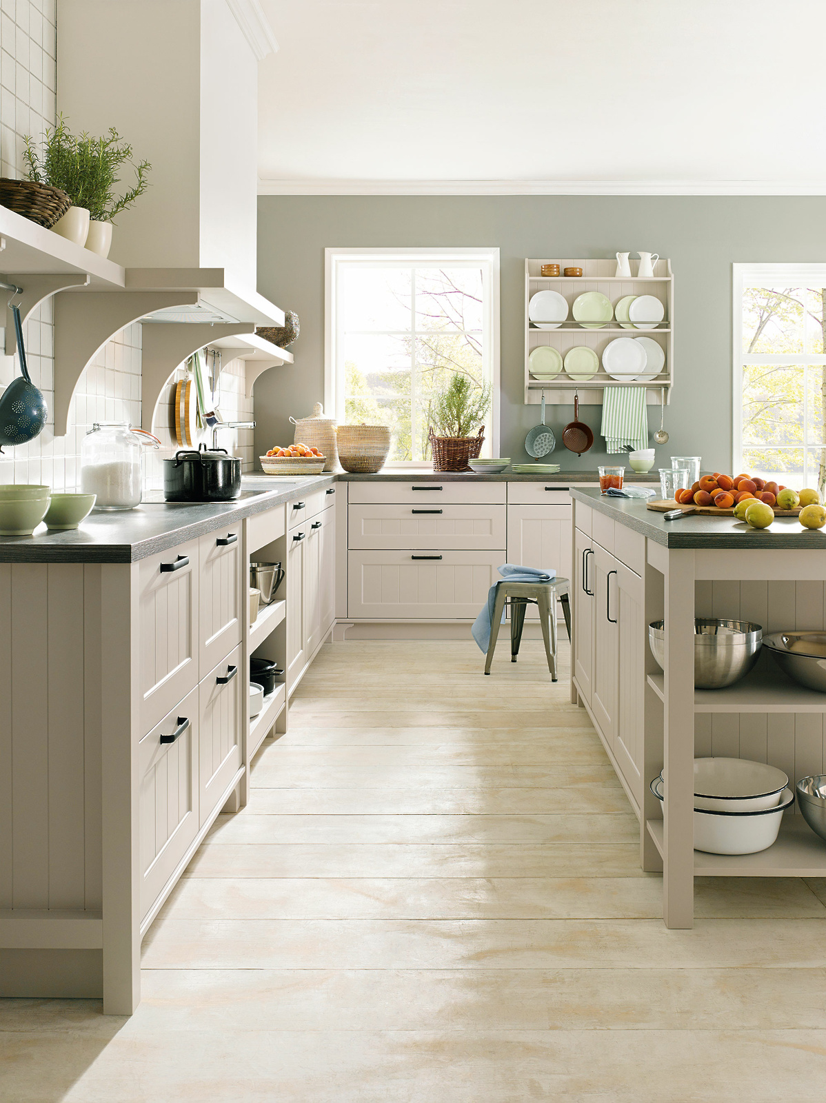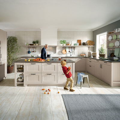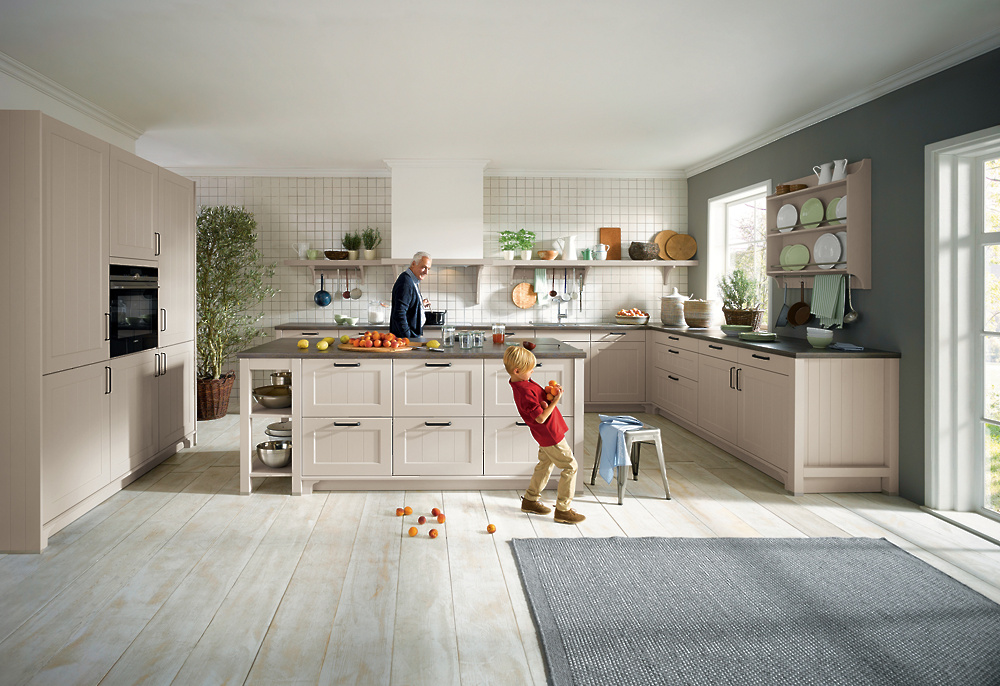 Če je kuhinjski prostor velik, odprt in napolnjen z naravno svetlobo, lahko v prostoru, vključno z enotami, delovnimi ploščami in tlemi, uporabimo temnejše odtenke. Temnejši les, kot je na primer oreh, bo prostoru dodal globino, čudovito pa ga dopolnjujejo svetlejši odtenki, kot so magnolija, ovseni kosmiči in mahovina. V veliki kuhinji je prostor tudi za kuhinjski otok, okoli katerega lahko družina in prijatelji sedijo skupaj s kuharjem, ko ta pripravlja okusen obrok.