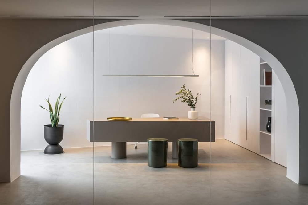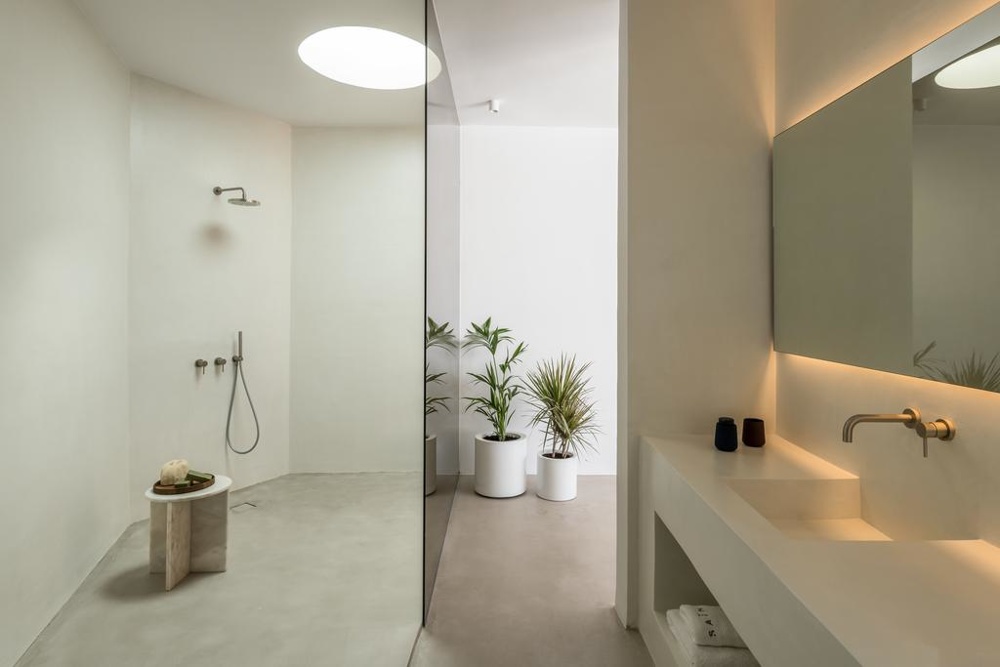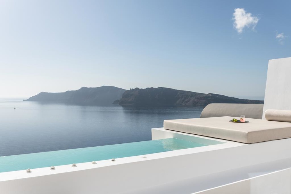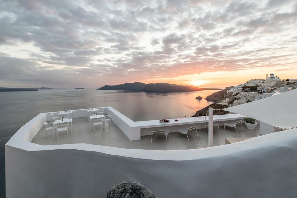 V notranjosti so se odločili za minimalističen pristop. Sobe so odete v belo barvo, z dodanimi odtenki zlate ali zelene. S tem so glavni fokus prenesli na moder ocean in zavite strope. Želeli so ustvariti idiličen prostor, v katerem bodo gostje zares užili čudovitost tega kikladskega grškega otoka.