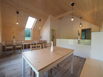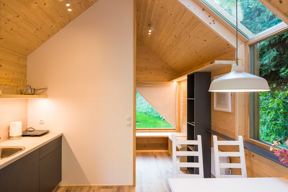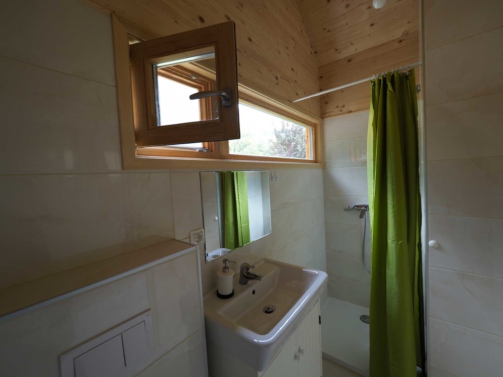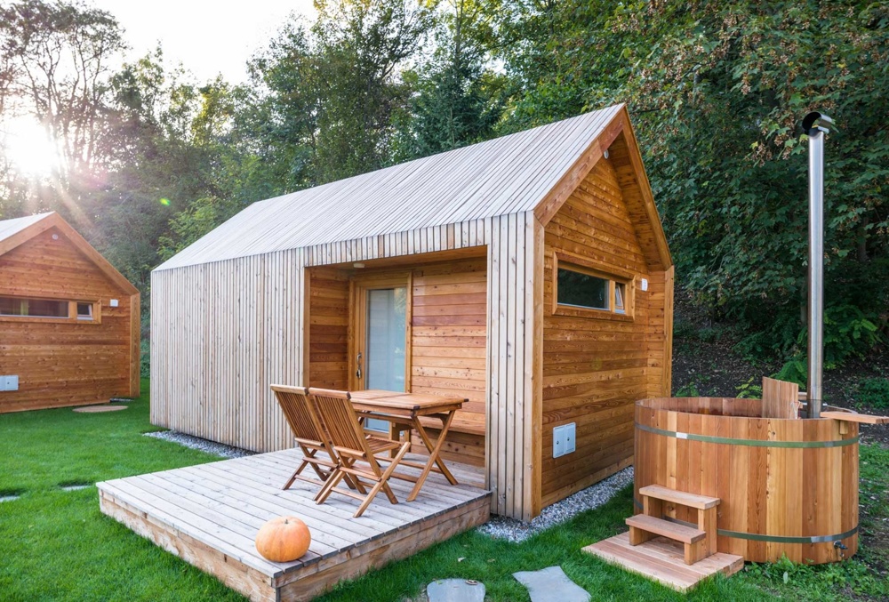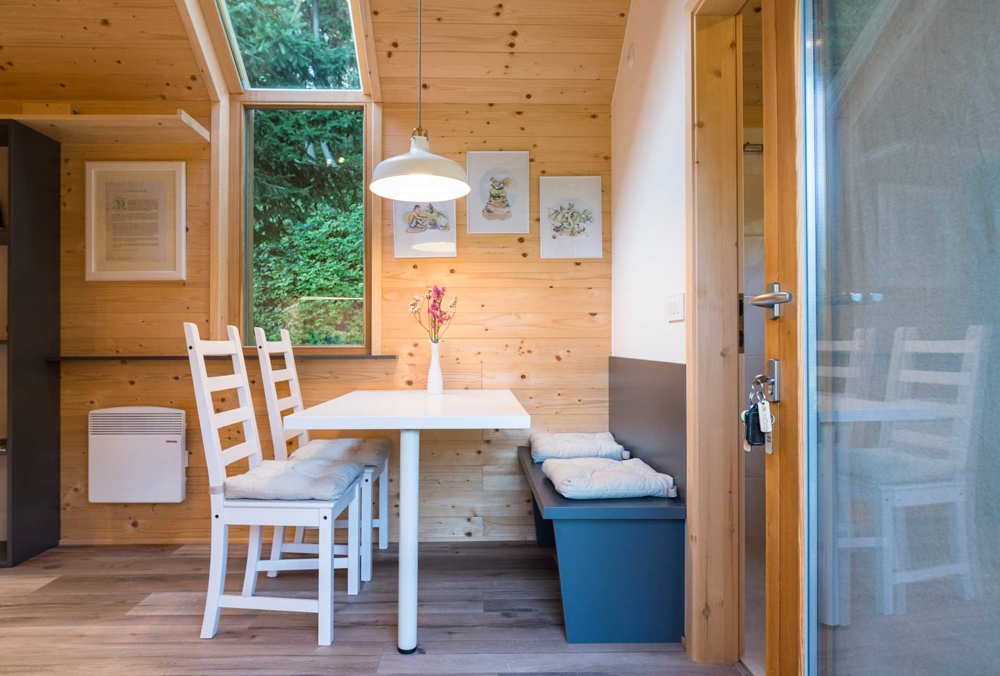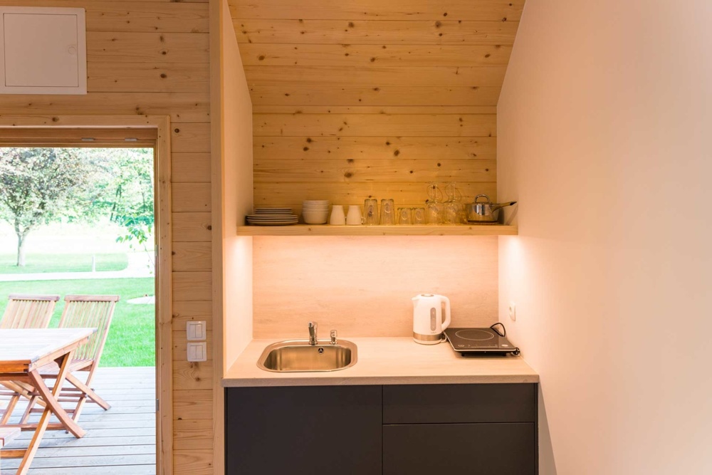 Hišice so zgrajene iz lesa in ostalih naravnih materialov, opremljene pa so v minimalističnem slogu, z velikimi panoramskimi okni, ki ponujajo pogled na okoliško pokrajino. Sprejmejo do 4 osebe, v njej sta 2 francoski postelji, bralni kotiček z velikim oknom, čajna kuhinja, osrednji prostor in kopalnica. Zunaj najdemo tudi teraso, s katere se raztezajo pogledi na hribe, poleg pa je tudi samooskrbni vrt, kjer si lahko postrežemo s svežo zelenjavo, zelišči in plodovi različnih sadnih dreves in jagodičevja.