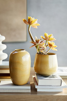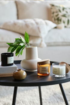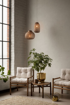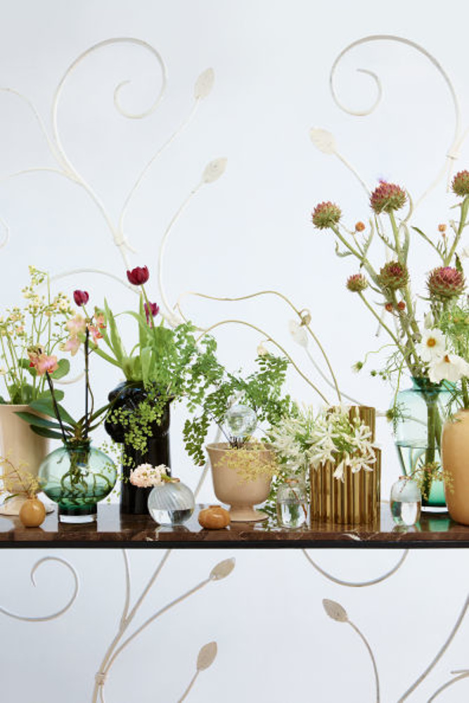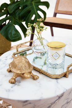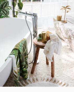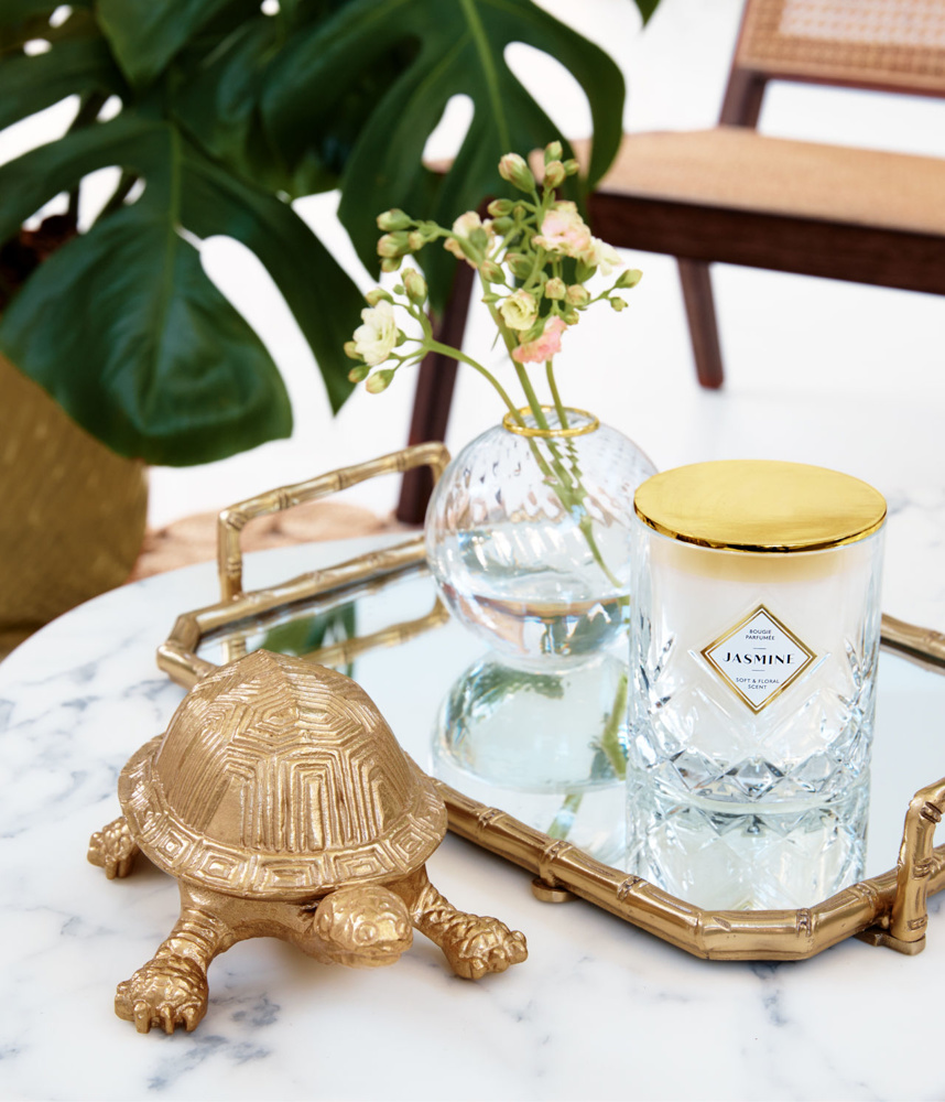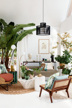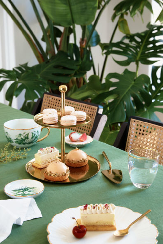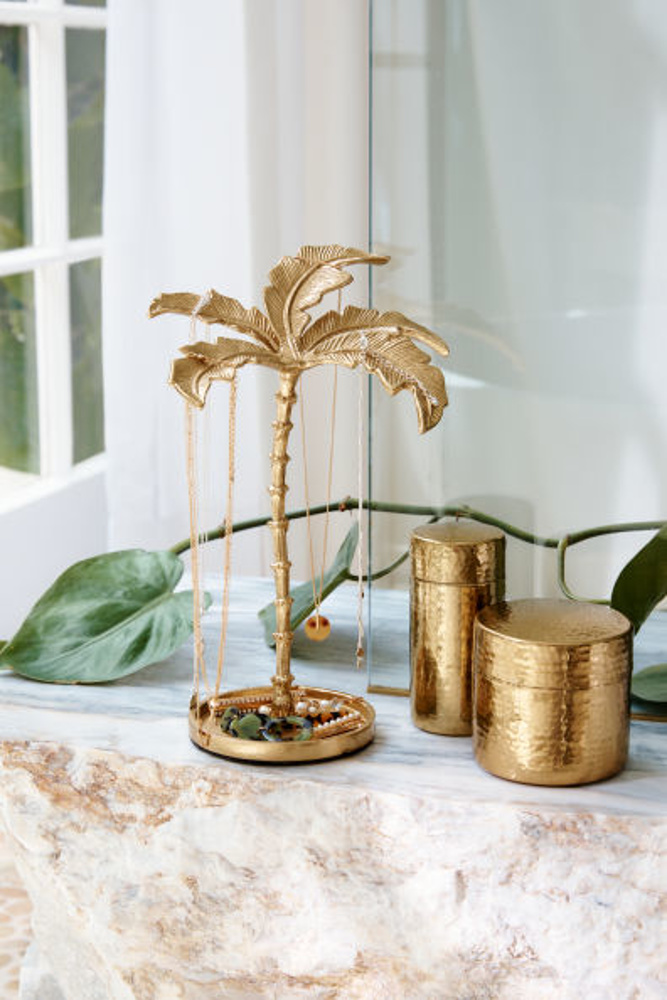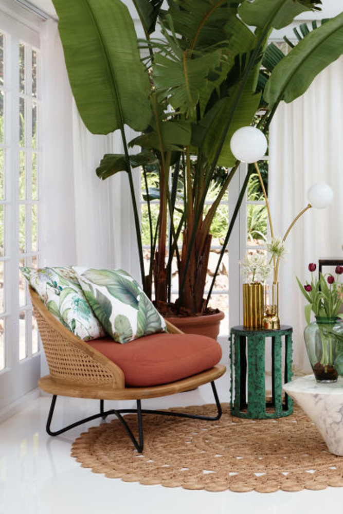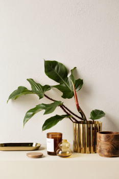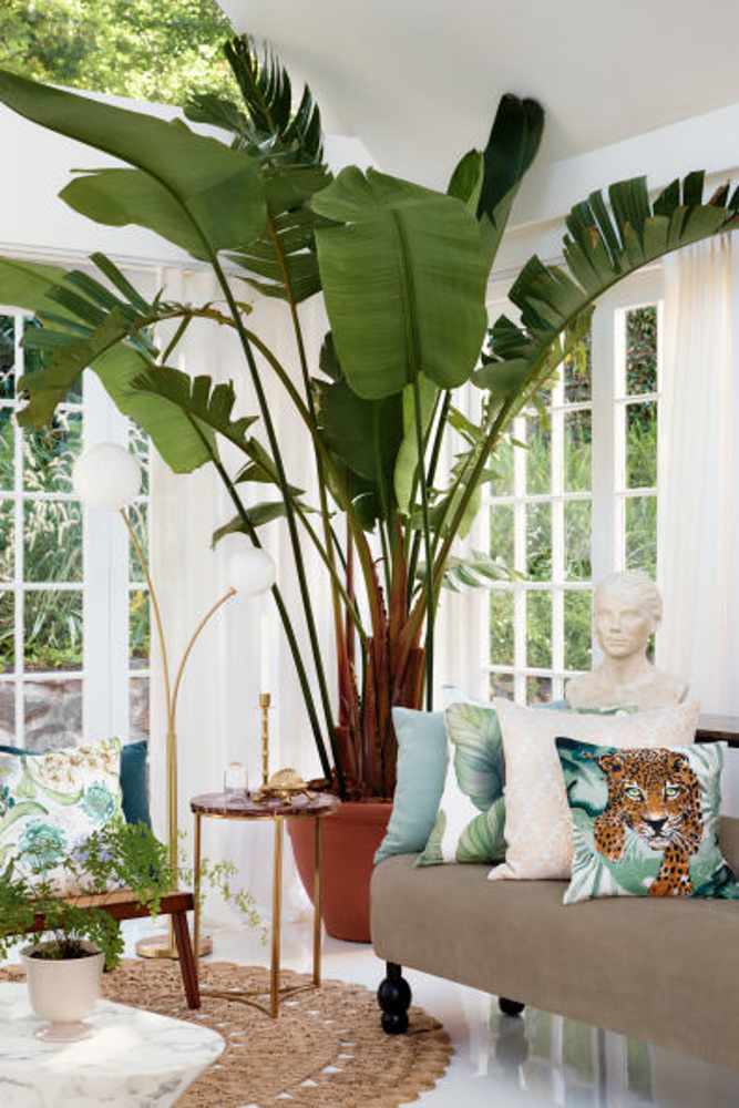 Za kolekcijo so značilni bujni odtisi listov, ki se lepo ujemajo z zlato obrobo na dodatkih, ki v prostor vnesejo svežino in eleganco.