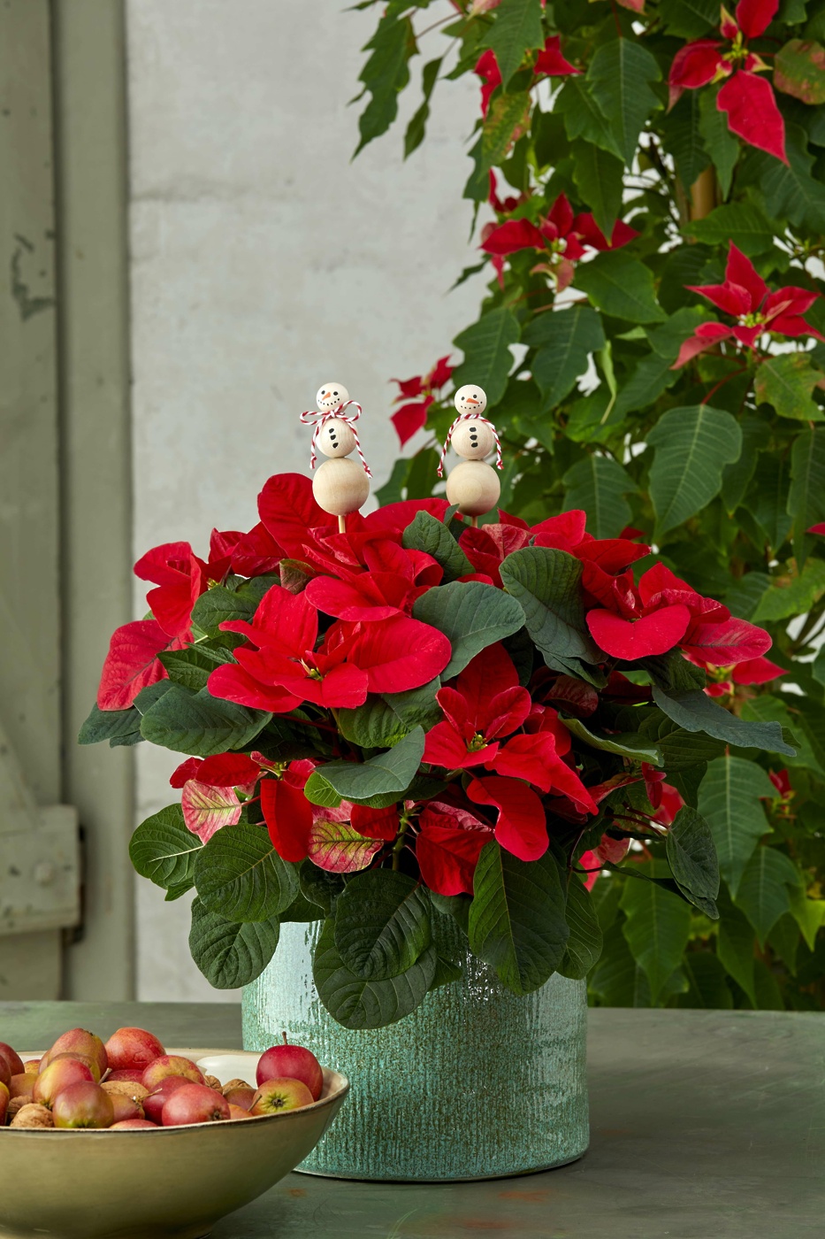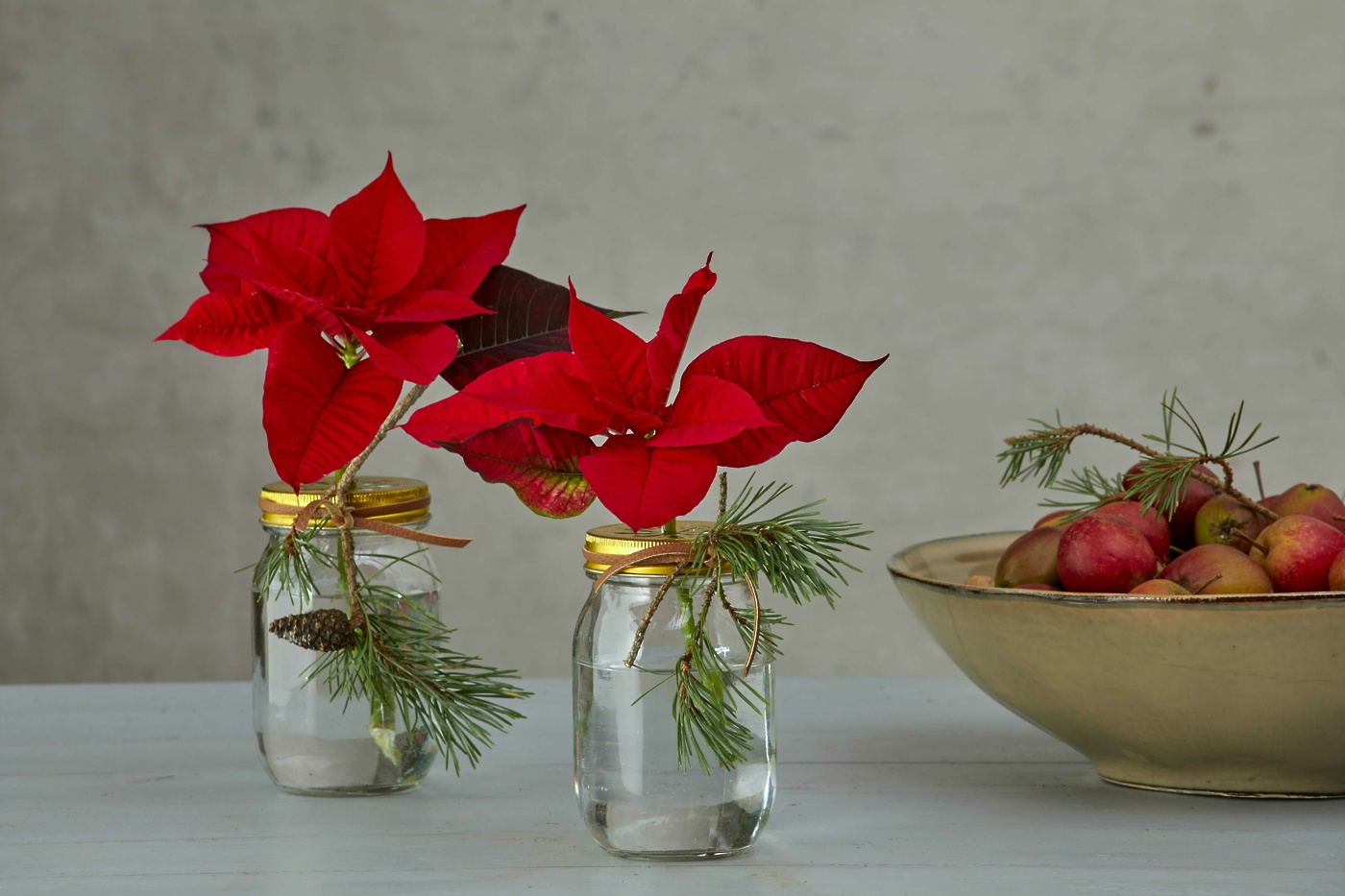 Manj je več. Za ta majhna darila z božično zvezdo potrebujete majhne steklene kozarce s pokrovčkom ter odprtino za slamico. Kozarce preprosto napolnite z vodo, slamice zamenjajte z rezanimi cvetovi božične zvezde in na rob pokrovčkov z vrvico pritrdite zimzelene vejice. Vaše darilo z božično zvezdo je pripravljeno!