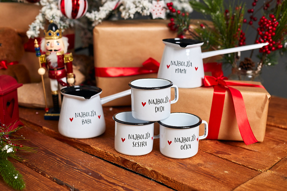 Tudi starše in stare starše, ki so čudovita mešanica smeha, skrbnih idej, čudovitih zgodb in predvsem ljubezni, je lepo razveseliti z manjšo pozornostjo ob koncu leta. Podarite jim izvirno božično darilo – emajlirane izdelke z napisi »najboljša babi, dedi, ati, mami« ... Kava ali čaj iz takšne emajlirane džezve ali lončka jih bo popeljala nazaj v otroške dni, obudila lepe spomine in jim polepšala dni.