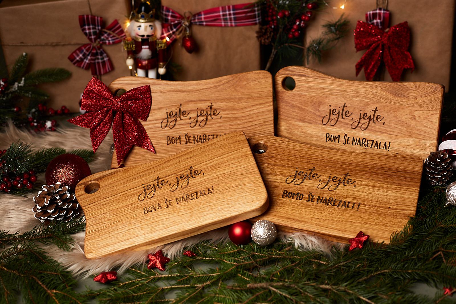Da praznične mize ne bodo polne le dobrot, pač pa tudi smeha, podarite lesene deske s šaljivim napisom z besedami naših mam in babic 'Jejte, jejte, bom še narezala.' Deske so v celoti izdelane v Sloveniji iz masivnega hrasta, na voljo so tudi deske z napisi za moški spol, dvojino in množino.