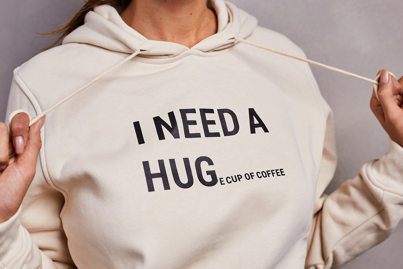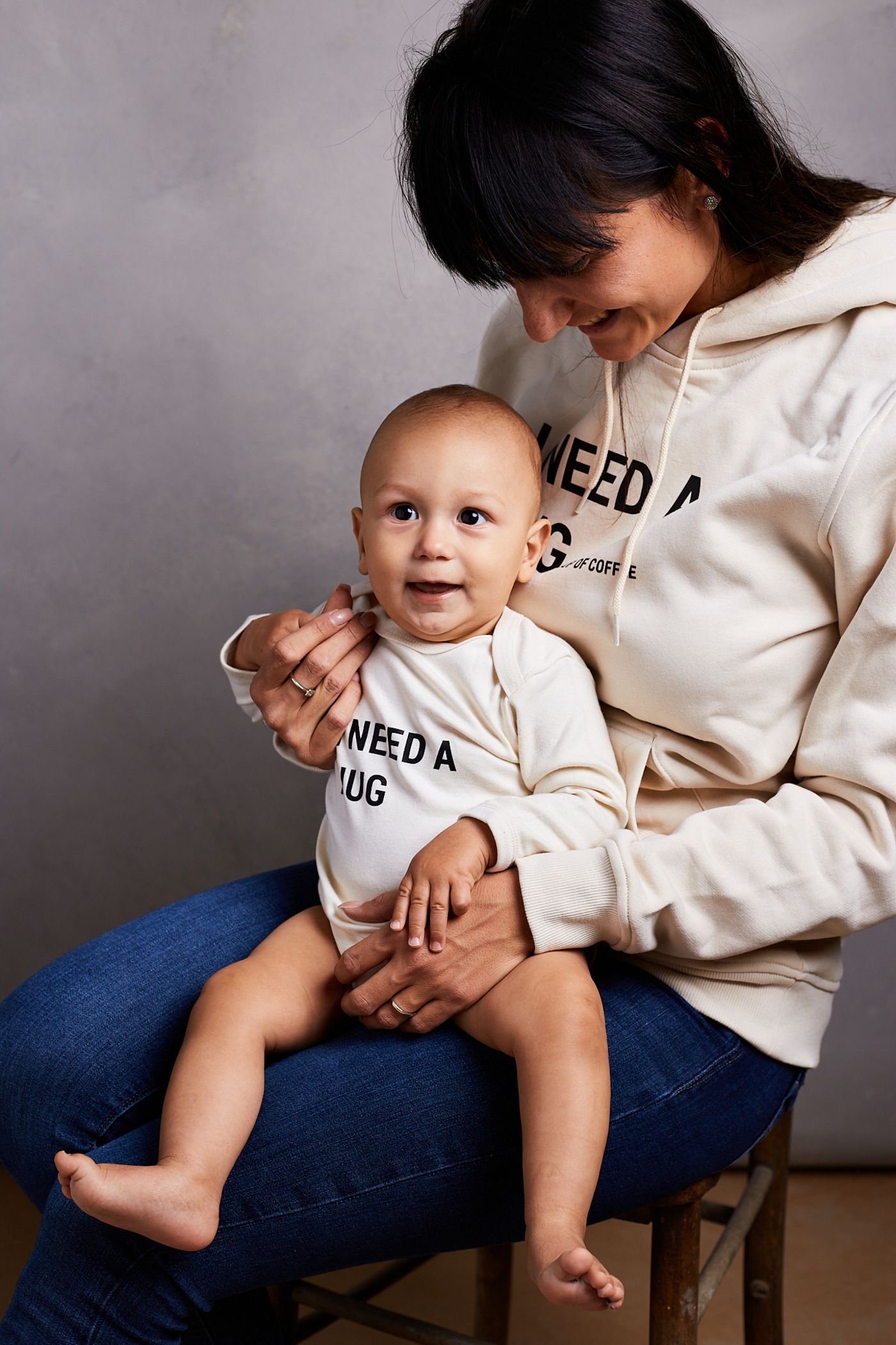 V teh dneh vsi potrebujemo topel objem! Za to bo poskrbel topel in izjemno udoben hoodie z iskrivim dvoumnim napisom, ki vas bo objel kot jutranja kava. Lahko ga kupite posamično (napis: I NEED A HUGe cup of coffee) in razveselite ljubitelje kave ali pa skupaj v kompletu z otroškim bodijem (napis: I NEED A HUG) in nasmejite tiste, ki v obdobju praznikov pričakujejo naraščaj ali pa imajo majhnega otročka.