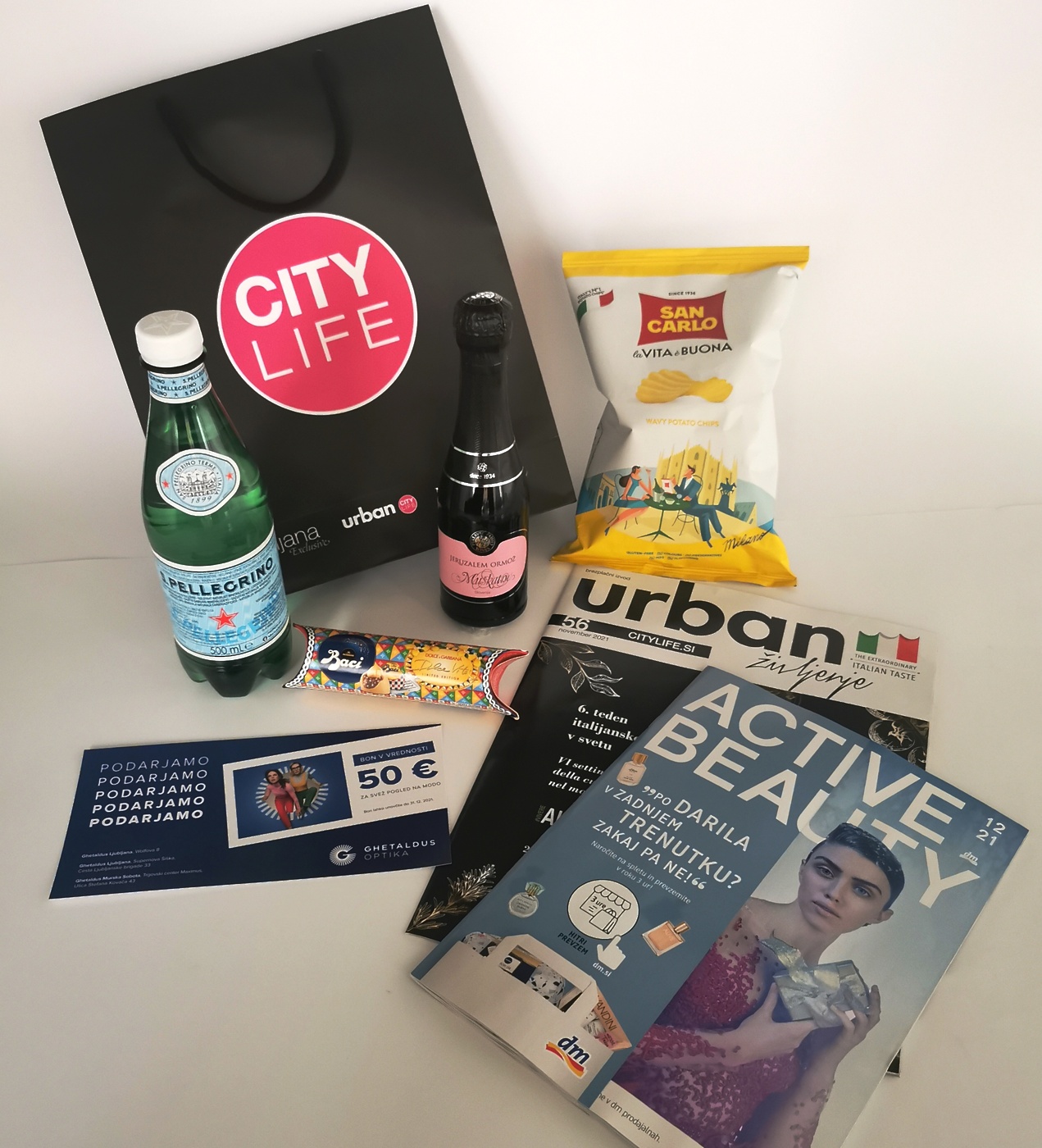 Pokrovitelji darilne vrečke: Voda San Pelegrino, Čokoladni bonboni Bacci, Muškatna Penina Jeruzalem Ormož, Čips San Carlo, darilni bon Optike Ghetaldus in revija Active Beauty DM.