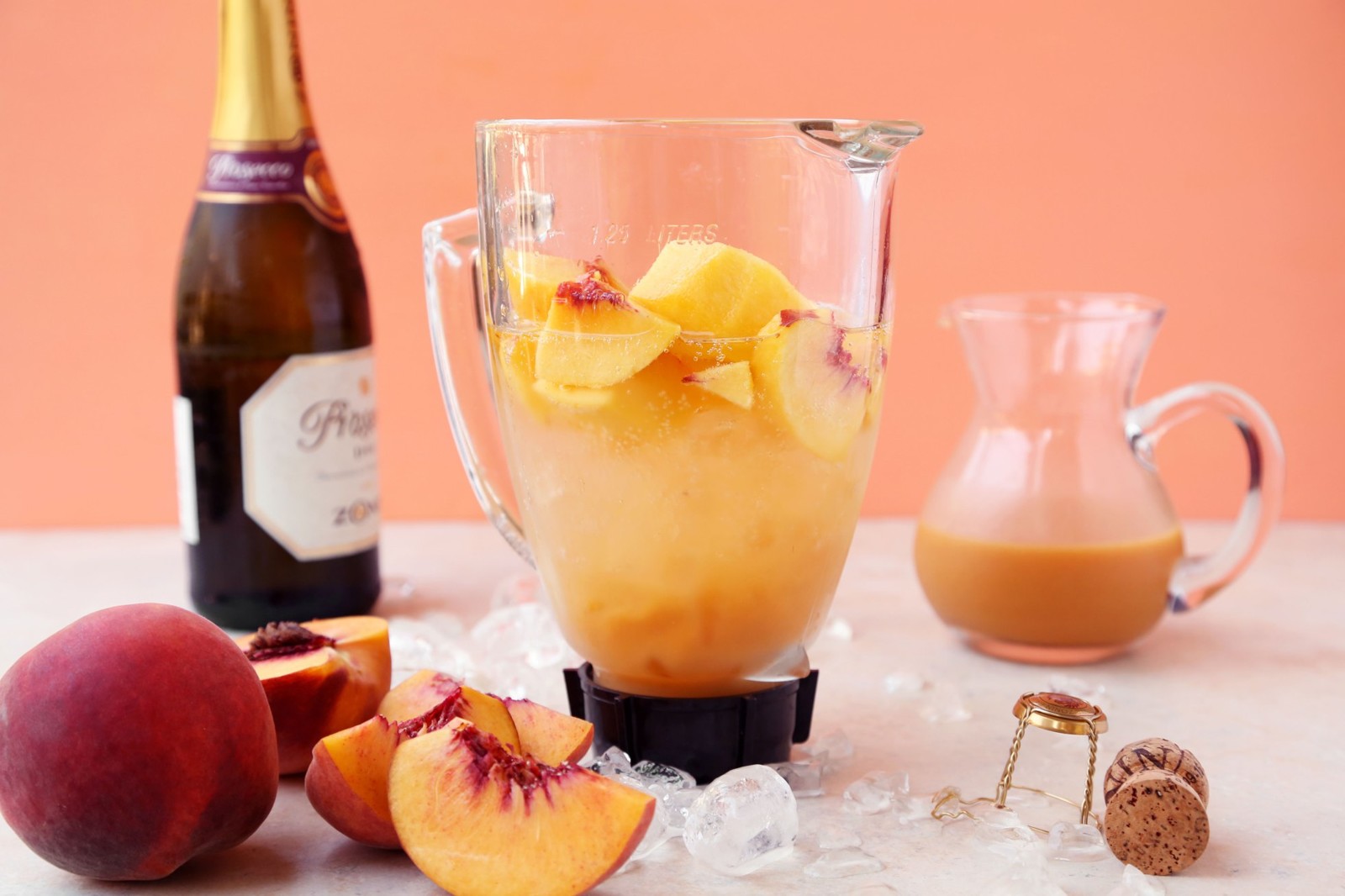 Za dišeč sadni koktalj potrebujemo le tri sestavine. V mešalniku združimo tri skodelice zmrznjenih rezin breskve, eno skodelico mangovega soka in steklenico ohlajenega Prosecca. Če slednjega nimamo, lahko uporabimo penino. Primerno tudi za dnevne zabave.