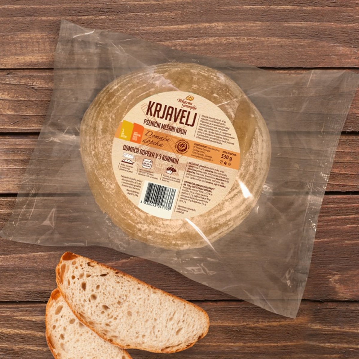 Prvi v družini novih kruhov je prepoznavni Krjavelj, ki je skrbno pripravljen, delno pečen in zapakiran v neprodušno vrečko. Hlebček vsebuje pšenično črno, polbelo in rženo moko. Narejen je po tradicionalni, dolgi metodi priprave testa z dodatkom naravnega kislega testa in brez dodanih aditivov. Pakiran hlebček je v polpečeni obliki, zato s kratko dopeko v domači kuhinji osvežimo aromo kruha in pridobimo hrustljavo skorjico.