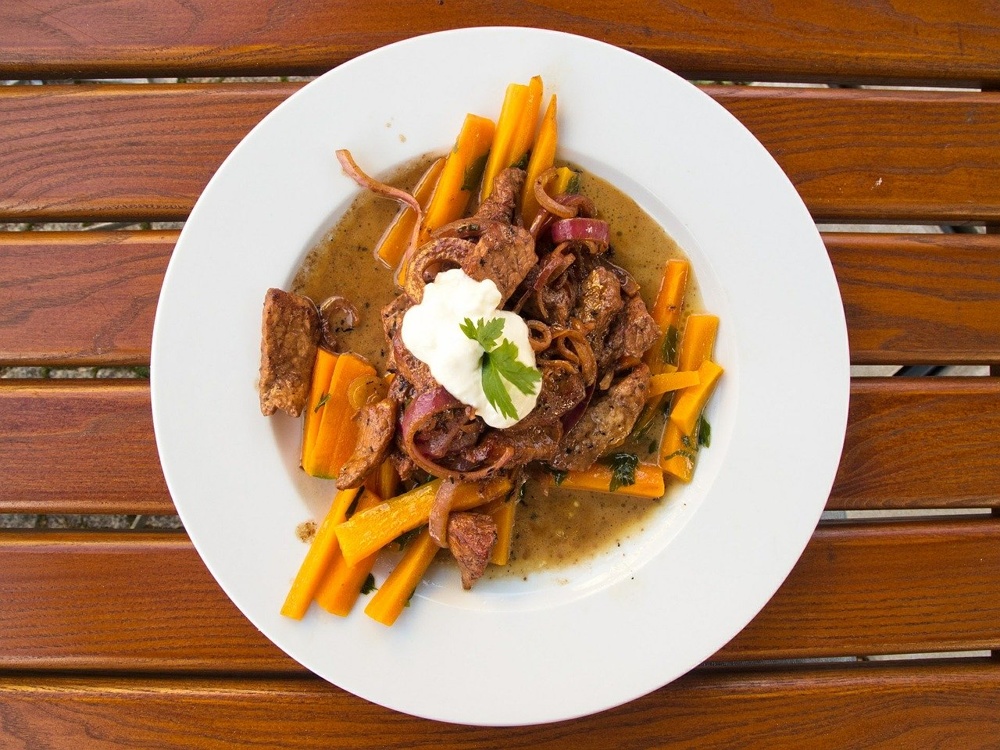 Praviloma toliko, kolikor imamo mesa za golaž, toliko čebule potrebujemo. Torej za 500 g govejega mesa potrebujemo 500 g čebule. Čebulo nasesekljamo ter popražimo na olju, da postekleni in spusti sok. Dodamo narezan strok česna, popražimo, da zadiši po česnu. Dodamo žlico moke, 2 žlici paradižnikove mezge in žlico rdeče paprike v prahu. Vse skupaj stalno mešamo. Meso narežemo na kocke, operemo in osušimo. Dodamo prepraženi čebuli in pražimo, da porjavi. Nato vse skupaj zalijemo z vodo, dodamo lovorov list, po okusu začinimo s soljo, poprom, dobro premešamo ter pokrijemo. Tako kuhamo 2 do 3 ure, vmes večkrat premešamo. Dlje in počasneje, kot se bo golaž kuhal, boljši bo.