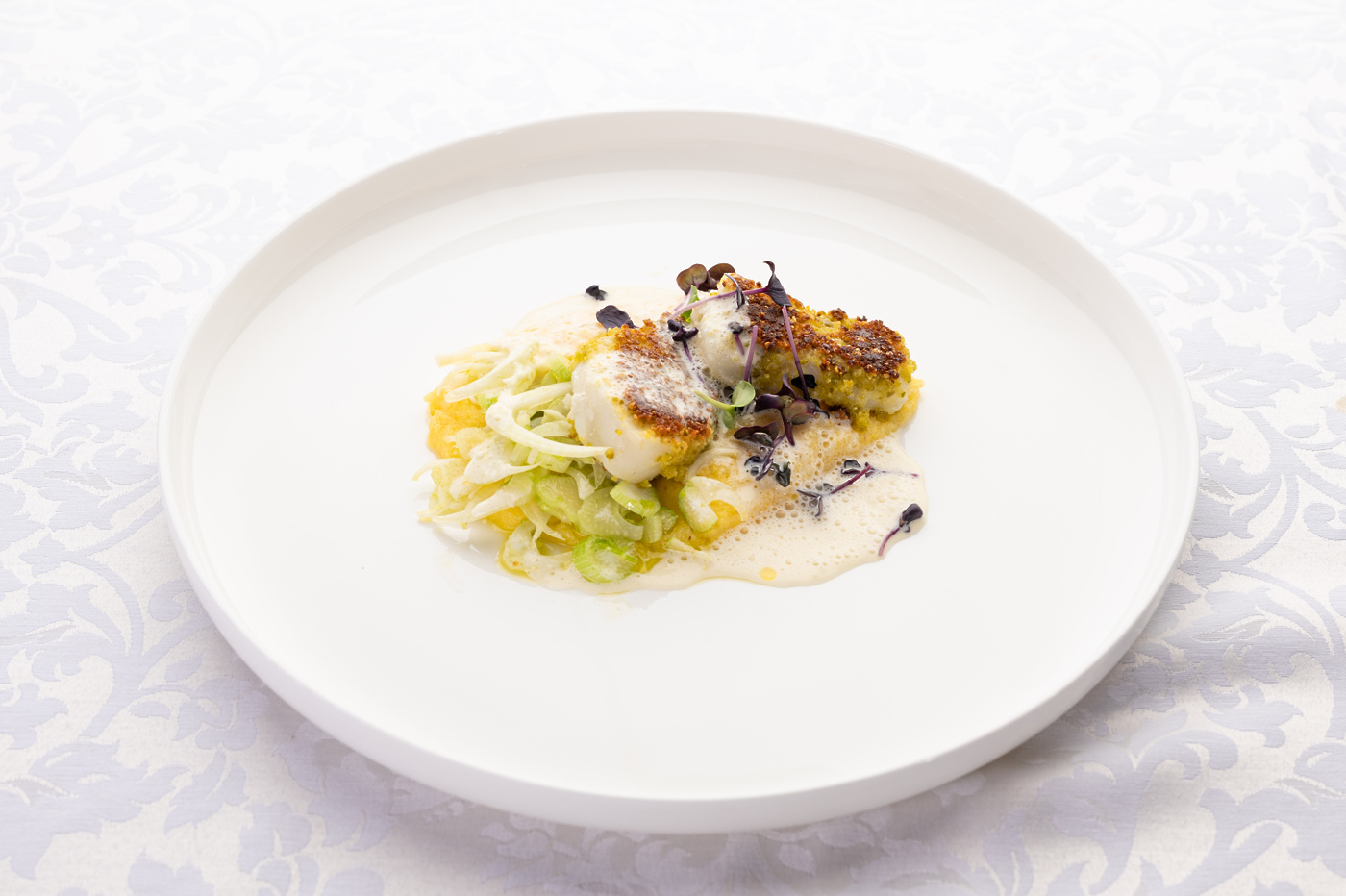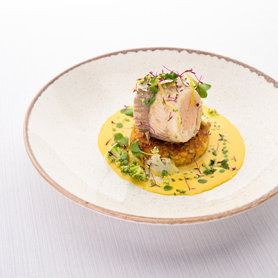 Korošica TR21j, Trska v skorjici pistacije, koromačeva omaka, maslena polenta, solatka koromača, foto: Grega Ravnjak.