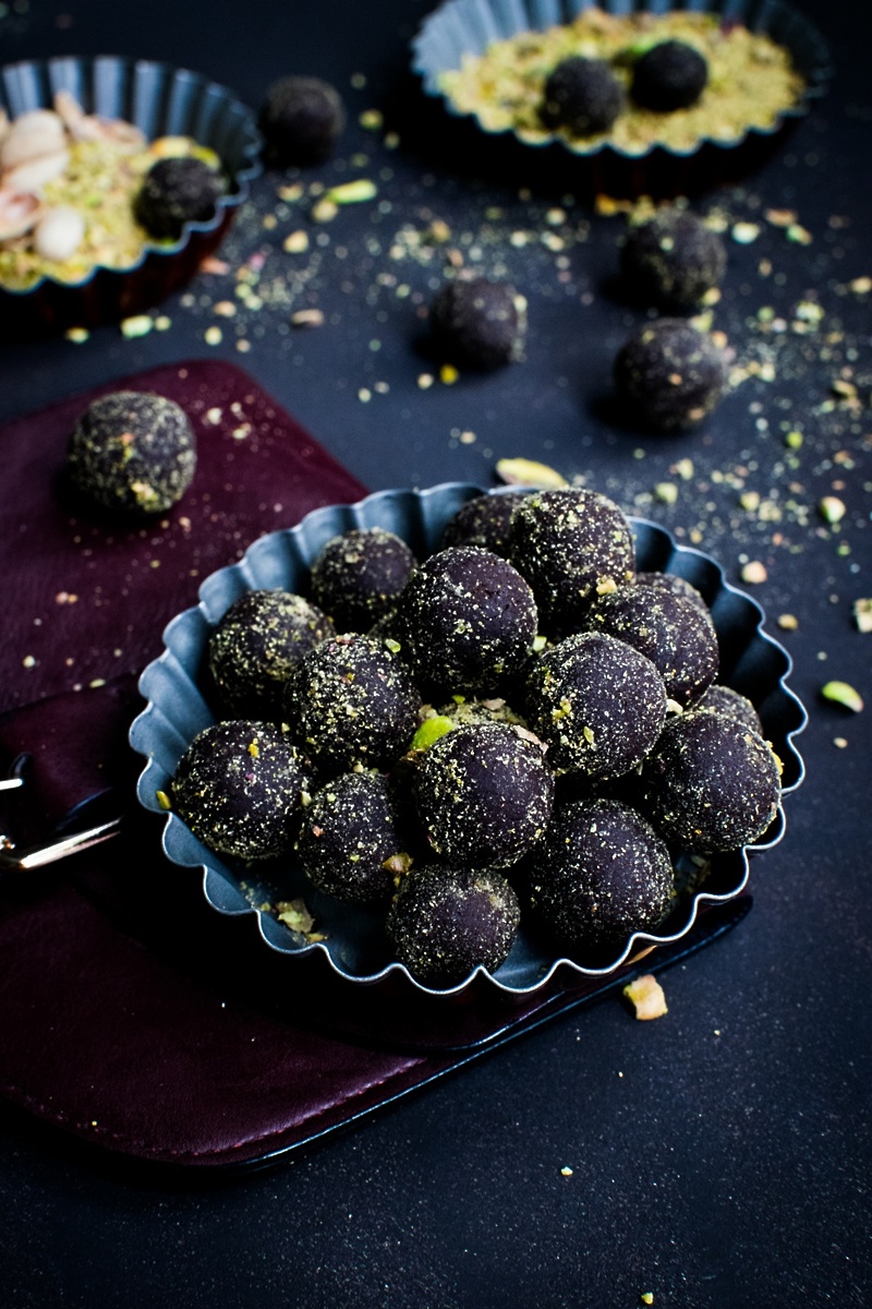 Posušenim figam odstranimo peclje in jih damo v srednje veliko posodo, zalijemo z vročo vodo in jih namakamo od 5 do 10 minut. V vmesnem času v mikserju zmešamo mandeljne in jim dodamo kakav v prahu, vanilijev ekstrat, cimet in sol. Odcedimo fige in jih dodamo ostalim sestavinam. Nato vse skupaj zmešamo v mešalniku, da nastane krhko testo. Celotno mešanico prestavimo v skledo in ji dodamo čokoladne kapljice. Ko imamo testo pripravljeno, vzamemo čajno žličko in oblikujemo približno enake kroglice. Kroglice za nekaj časa postavimo v hladilnik in jih kasneje postrežemo.