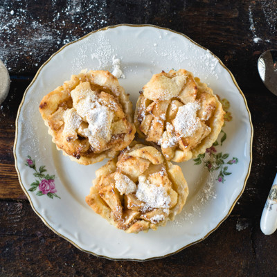 Priprava: Olupljena jabolka in banane narežemo na majhne koščke. Damo jih v skledo, potresemo s sladkorjem in cimetom, dodamo limonin sok in malo ruma ter dobro premešamo. Vse skupaj stresemo v kozico z maslom in rahlo podušimo. Nato se lotimo priprave testa. Vse sestavine stresemo v globoko skledo in dobro zgnetemo. Testo na tanko razvaljamo in razdelimo na dva dela. Iz enega naredimo toliko modelov, kolikor šteje naš pekač za mafine, preostali del narežemo na tanke trakove. Pekač za mafine namastimo, obložimo s testom, vanj nadevamo nadev, po vrhu pa spletemo mrežo s preostalim testom. V ogreti pečici pečemo od 15 do 20 minut na 200 stopinj Celzija, dokler testo lepo ne zarumeni. Pred serviranjem jih potresemo s sladkorjem v prahu.