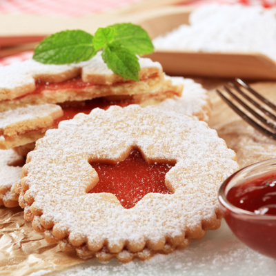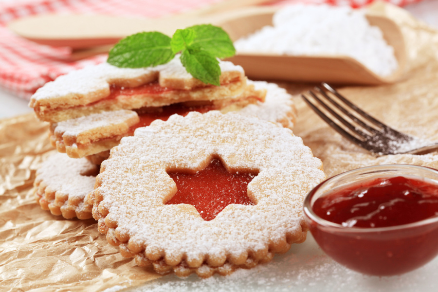 Ko je testo ohlajeno, iz zmrzovalnika vzamemo prvo polovico, jo razvaljamo do debeline pol centimetra in s pomočjo modela izrežemo kroge, ki bodo služili kot spodnji del keksa. Postavimo jih na peki papir in pustimo počivati 30 minut. Enako storimo z drugo polovico, vendar tem krogom izrežemo tudi sredino, katero bomo napolnili z marmelado.
