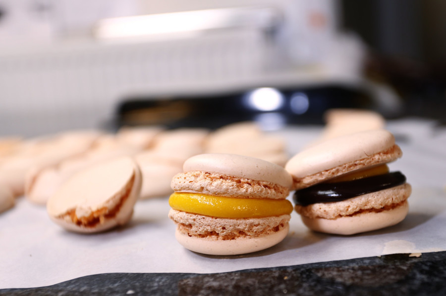 Za meringo začnemo stepati beljake, vlijemo 500 g sladkorja, zavretega na 118 stopinj Celzija. Stepamo okoli 10–15 minut. Za mandljevo maso zmešamo 262 g sladkorja v prahu, zmletega z mandlji v moko, in 80 g beljaka. Dobro zmešamo. Ko je pena iz beljaka čvrsta, vmešamo mandljevo maso in mešamo toliko časa, da je masa srednje tekoča. Nabrizgamo in pečemo 12 minut na 150 stopinj Celzija. Ohladimo in nabrizgamo. Mangov nadev pripravimo tako, da zmešamo mangov pire, limonin sok in agar agar. Vse skupaj nato kuhamo do vrelišča, ohladimo in spasiramo. Za čokoladni nadev zavremo smetano in med. Prelijemo čez čokolado, pustimo minuto in spasiramo. Ohlajeno nabrizgamo. Makrone okrasimo in postrežemo.