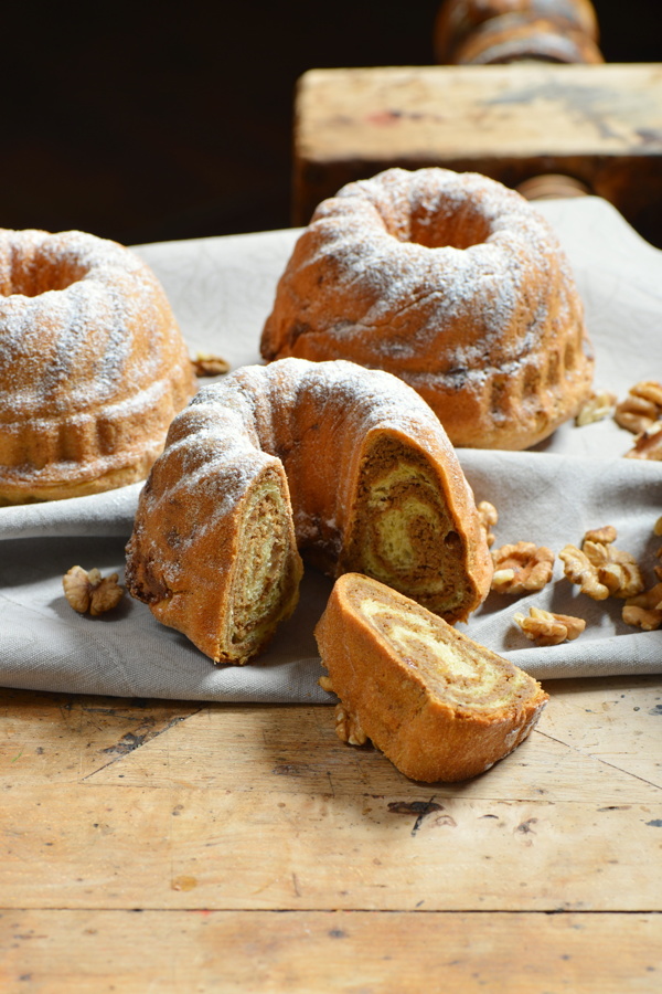 Priprava: V mlačno mleko damo kvas in dodamo malo sladkorja ter pustimo, da se kvas raztopi. V posodo, v kateri bomo mesili testo, presejemo moko in sol, dodamo rumenjak, rum, limonino lupinico, preostali sladkor, stopljeno maslo in mleko s kvasom. Zamesimo testo in ga pokritega pustimo vzhajati. V posodi zmešamo mlete orehe, sladkor, vaniljev sladkor in limonino lupinico. V kozici segrejemo sladko smetano ali mleko ter jo/ga prelijemo čez orehe s cimetom in premešamo. Nato dodamo jajce, žličko zmehčanega masla in rum ter spet premešamo. Na koncu primešamo beljakov sneg. Ko je testo vzhajano, ga razvaljamo v pravokotnike in namažemo z nadevom. Zvito rolico potice razrežemo na manjše dolge rolice in jih položimo v silikonski pekač za mini potice. Mini potice v modelu pustimo vzhajati pol ure. Pečico segrejemo na 180 stopinj Celzija. Potičke pečemo približno 25 minut. Ko se ohladijo, jih po vrhu posujemo s sladkorjem v prahu in postrežemo.