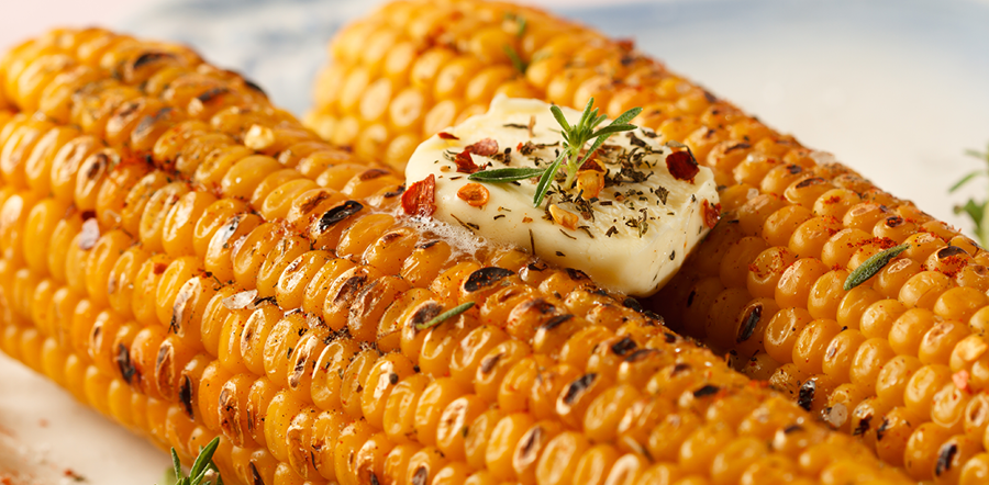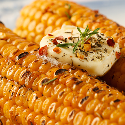 Pečena koruza z zeliščnim maslom je prava poletna klasika. Najokusnejša je mlada mlečna koruza, pečena na odprtem ognju, lahko pa jo pripravimo tudi na žaru ali v pečici. Za božanski okus pečeni koruzi na koncu dodamo še zeliščno maslo.