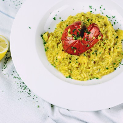 Priprava: Na maslu popečemo rakce, začinimo in odstavimo. V visoki ponvi posebej segrejemo maslo in olivno olje, dodamo čebulo in česen, kuhamo od tri do štiri minute. Dodamo riž in mešamo še tri minute. Nato dodamo sesekljane paradižnike in vino ter pustimo, da malo povre. Počasi dodajamo jušno osnovo in mešamo, dokler se riž ne skuha. Tik pred tem dodamo še rakce in parmezan ter počasi zamešamo v rižoto. Na koncu dodamo še smetano. Začinimo lahko še z mletim poprom in svežo baziliko.