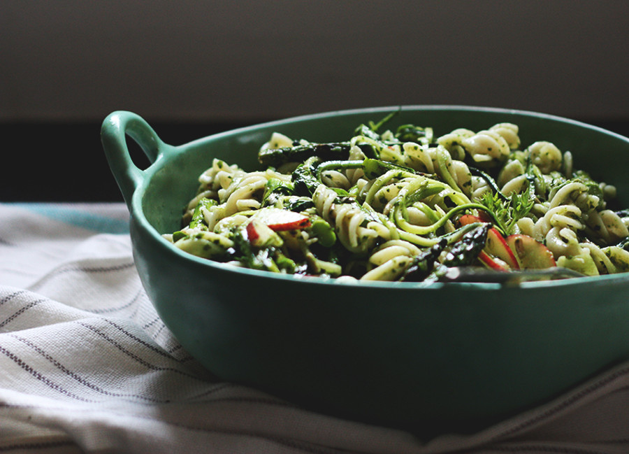 Spodnjo polovico špargljev olupimo ali pa jim odstranimo trde, olesenele dele. Izbrane testenine skuhamo, kot je navedeno na pakiranju, za "al dente" pa jim kuhanje za kakšno minuto ali dve skrajšamo. Medtem ko se kuhajo testenine, na ponvi segrejemo olivno olje, dodamo pinjole in česen in jih pražimo do zlate zagorelosti (okoli minuto ali dve), dodamo narezane beluše in večkrat premešamo. Po približno treh minutah so šparglji primerno omehčani in pripravljeni za solato. Mešanico špargljev dodamo k izbranim testeninam, skupaj s ščepcem soli in poprom, pred serviranjem pa solato posujemo še s parmezanom. Postrežemo lahko takoj, okusna pa je tudi kot hladna jed.