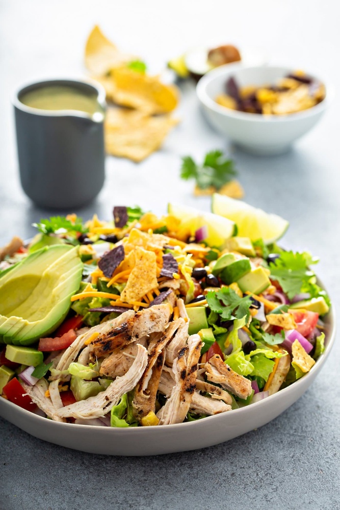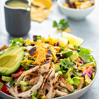 Tortilje narežemo na trakce in jih položimo na peki papir. Popršimo jih z oljem in začinimo s soljo ter poprom. Popečemo v pečici na 220 stopinjah Celzija. V večji ponvi segrejemo olje in na njem popečemo purana ter dodamo začimbe. V posodi skupaj zmešamo vse prelive. V drugo posodo dodamo vso zelenjavo in jo začinimo z začimbami ter jogurtovim in ostalimi prelivi. Vse skupaj zmešamo, po vrhu posujemo rezine tortilje in postrežemo.