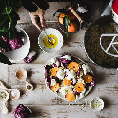 »Ko pripravljam hrano, vedno gledam, da zavržem čim manj. Velikokrat si pripravim malce večjo količino jedi, da jo imam lahko na jedilniku še naslednji dan, kadar pa mi od kosila kaj ostane, mi je to velik kulinarični izziv. Vedno dobro razmislim, kaj bi z ostanki lahko ustvarila, in skoraj vedno se jih da porabiti za pripravo kakšne druge okusne jedi,« je prepričana avtorica kulinaričnega bloga Use your noodles Anja Burgar. Od kosila ji velikokrat ostane piščanec, ki ga je mogoče porabiti na številne načine. S pomočjo kuhinjskega robota Kenwood kMix ga je tokrat natrgala in iz njega ustvarila barvito sezonsko solato z radičem in klementinami.