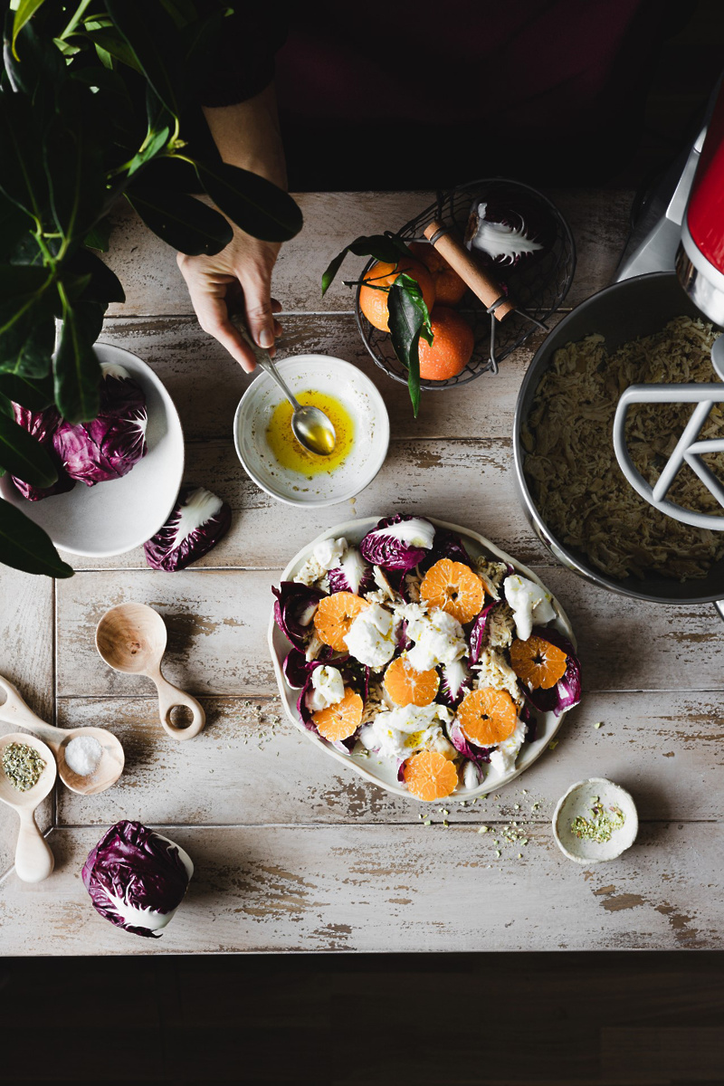 Priprava: Radič operite in natrgajte. Klementine operite, olupite in narežite na rezine, potem pa pripravite preliv. V posodo nalijte olivno olje, dodajte limonin sok, sol, poper, čili in origano. Dobro premešajte. Pistacije dobro nasekljajte, potem pa natrgajte še piščančja prsa. Stresite jih v posodo mešalnika in mešajte, dokler meso ne razpade na drobne trakce. Čez meso prelijte 2 žlici preliva in dobro premešajte. Radič razporedite po plitvem krožniku, dodajte piščanca in klementine. Zatem dodajte natrgan burrata sir. Na koncu pokapajte s prelivom in potresite z nadrobljenimi pistacijami.
