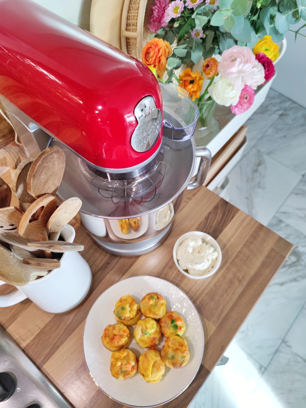 Kam pa z ostanki zelenjave? Avtorica kulinaričnega bloga Mama kuha Vita Starman svetuje, da jo s pomočjo kMixa vmešate v hitre jajčne mafine brez moke. »Priprava vam bo vzela največ 10 minut, vanje pa lahko dodate katerokoli zelenjavo – špinačo, grah, korenje, brokoli, vse, kar vam ostaja v hladilniku in morate čim prej porabiti,« pravi Vita Starman, ki se je tokrat poigrala z zelenjavo, ki ji je ostala pri pripravi francoske solate.