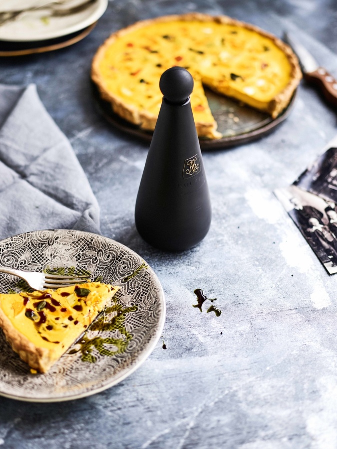 Njihovo steklo je najbolj neoporečno za živilo, v tem primeru bučno olje, katerega shranitev je najprimernejša v stekleni temni embalaži. Polnitev steklenice je ekološko bučno olje narejeno iz prebranih in sortiranih bučnih semen avtohtone sorte, ki so zrasla še na neokrnjeni zemlji v okolici oljarne Kocbek. Prečiščena semena sortirajo in jih zmeljejo na mlin s pravimi kamni, katere so pri Kocbekovih začeli uporabljati že pred 89 leti. Na steklenici je tudi poseben znak, povzet iz prvega žiga (štampiljke) Alojza Kocbeka in njegovih inicialk, katere izvedba bo za Arabski trg tudi v zlati ploščici čistine 999,9. Steklenica vsebuje lastno pipeto, s katero se olje nanaša na hrano po kapljicah in se ne izliva iz steklenice. Pipeta služi kot zamašek steklenice in je pripomoček kuharskim mojstrom, da z njo dekorirajo krožnike. Oljarna Kocbek s svojimi ambasadroji Tomažem Kavčičem, Janezom Bratovžom in Ano Roš s to steklenico že predstavlja svojo zgodbo tudi na njihovih jedeh.