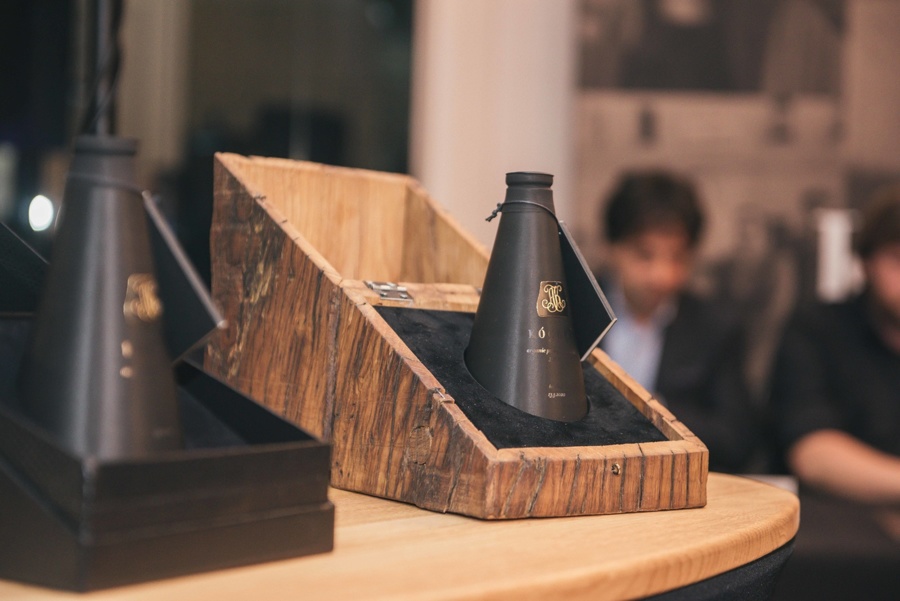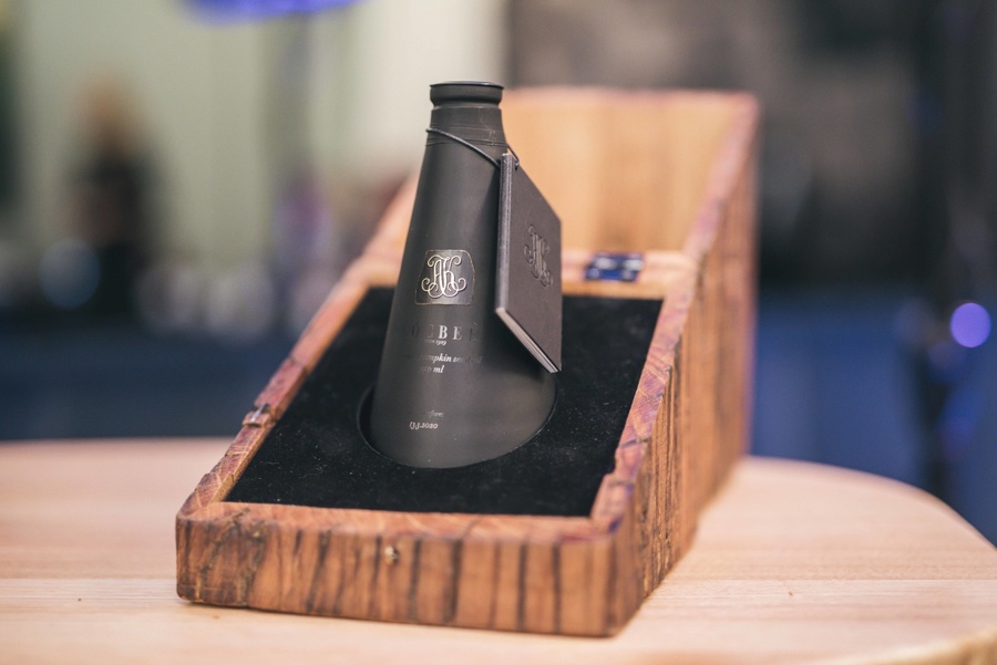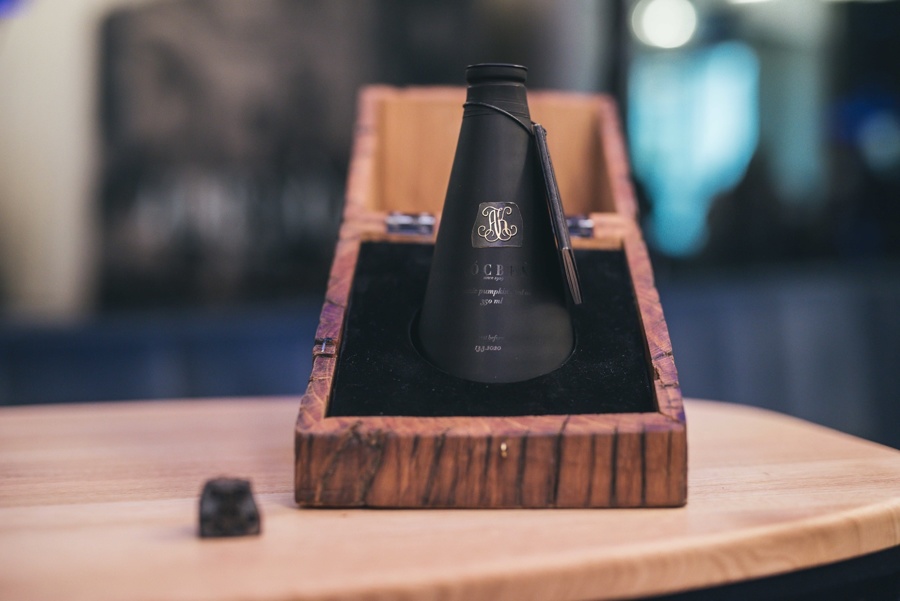 Črna steklena steklenička bučnega olja Kocbek v leseni škatli iz stoletnega hrasta stane 350 evrov. (foto: Mediaspeed)