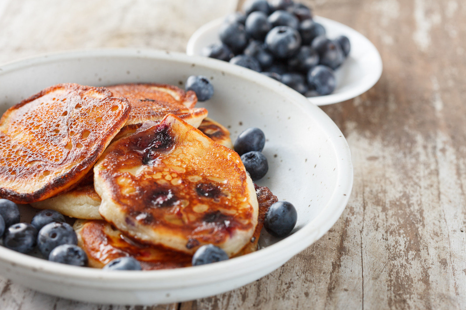 Mini ameriške palačinke so ravno prav puhaste in slastne. Dodamo skuto, borovnice ter nekaj medu in že lahko uživamo v božanskem zajtrku.