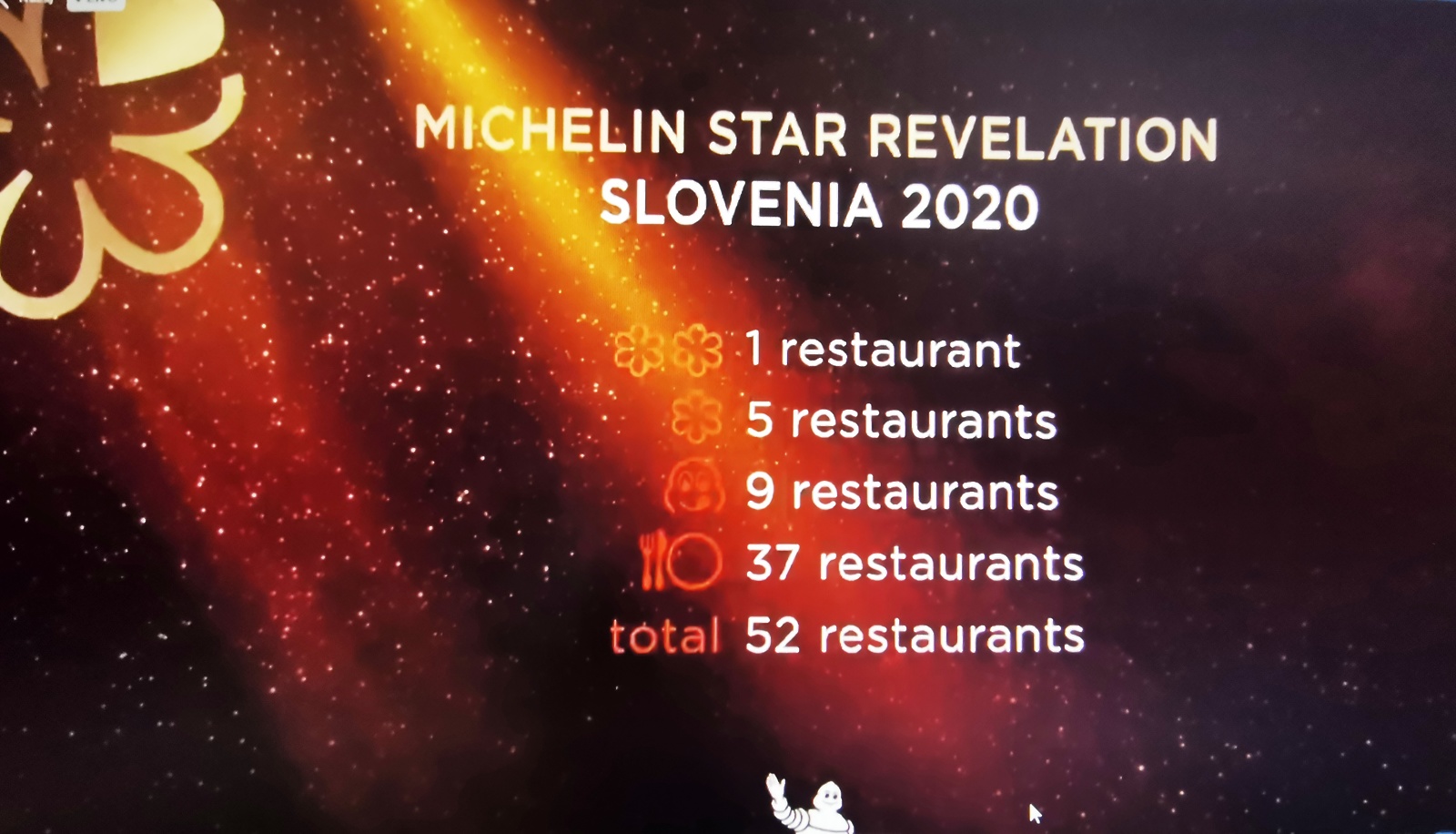 Po nekaj letih pričakovanj je Slovenija končno dobila svoj Michelinov vodič in ob premierni podelitvi skupaj kar sedem Michelinovih zvezdic. Podelitev bi morala potekati že v marcu, a je koronakriza organizatorjem, Slovenski turistični organizaciji in organizaciji Guide Michelin, prekrižala načrte.