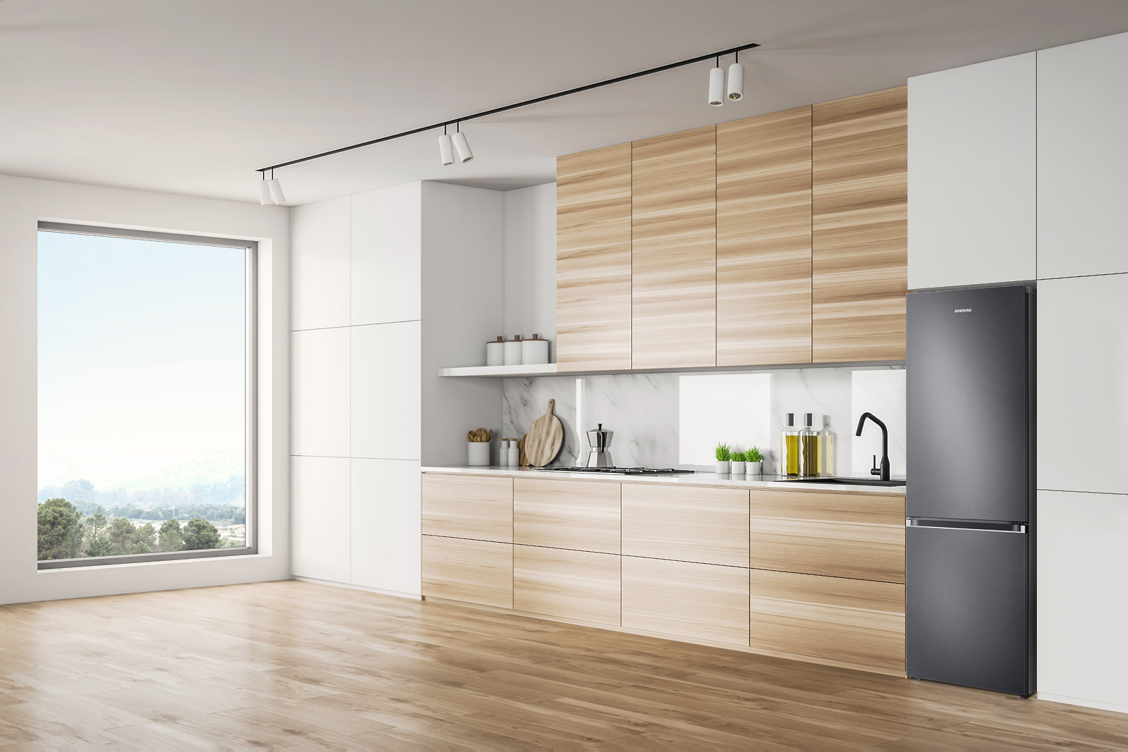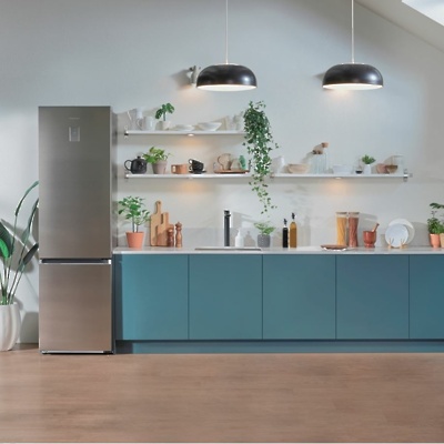 Med naprednimi izdelki je tudi novi, tihi in energijsko varčni hladilnik Samsung RB7300T z zamrzovalnikom spodaj in tehnologijo SpaceMax™, ki ponuja več svežega prostora znotraj in enako eleganten stil zunaj. Prostorna shramba v minimalistični zasnovi s standardno globino se bo elegantno zlila z našim kuhinjskim pohištvom in enakomerno hladila notranjost hladilnika v vseh kotičkih.