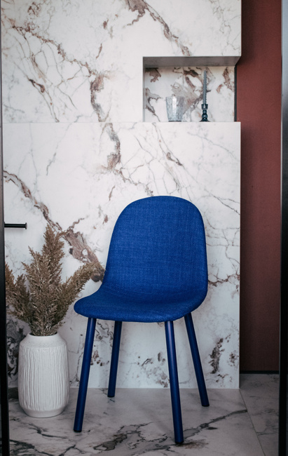 Z elegantnim dizajnom in mehkimi oblazinjenji je lahko minimalističen, trendovski modri stol prava izbira za ustvarjanje »hygge« kotička. Modra barva bo dodala občutek umirjenosti in harmonije v vašem prostoru.