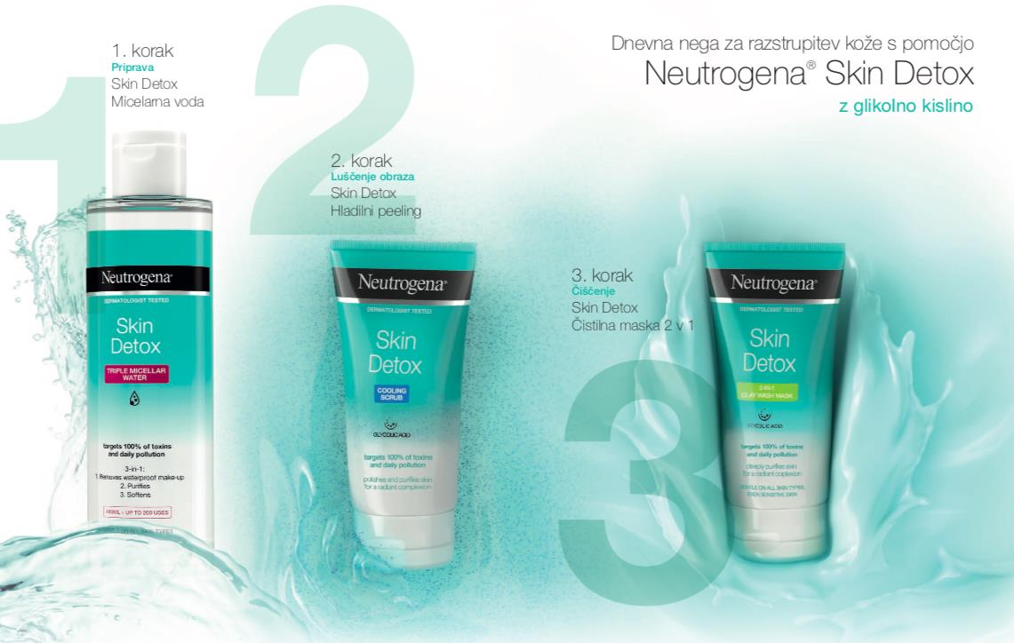 Onesnaženje zraka je, glede na zadnje raziskave o izpostavljenosti, dejavnik prezgodnjega staranja. Ker pa onesnaženost zraka močno narašča, prav tako narašča tudi njen vpliv na kožo. Znanstveniki so zato osredotočeni na škodo, ki jo koži povzročajo onesnaževalci zraka, saj zamašijo pore, dehidrirajo kožo in vodijo v prezgodnje staranje - prodrejo globoko v kožo, povzročajo izsušenost, vse to pa pospeši staranje kože. Rešitev je, da pravilno očistimo in razstrupimo kožo s primernimi proizvodi. Novi Neutrogena® Skin Detox asortiman za boj proti strupom in onesnaževalcem je razvit v pomoč koži, z namenom, da le-ta ponovno pridobi svoj izgubljeni sijaj, ne da bi jo izsušil. Glikolna kislina izhaja iz sladkornega trsa. Je moderen trend v strokovni kozmetologiji. Priporočena je zaradi svojega učinkovitega luščilnega delovanja, zahvaljujoč mikrogranulam, ki prodredjo globoko v pore ter jih očistijo vseh ujetih nečistoč, ne da bi dražile kožo. Posebna prednost Skin Detox asortimaja je, da ne izsuši kože, saj ohrani vso potrebno vlago v koži ter ji pomaga povrniti izgubljeno mehkobo in sijaj.