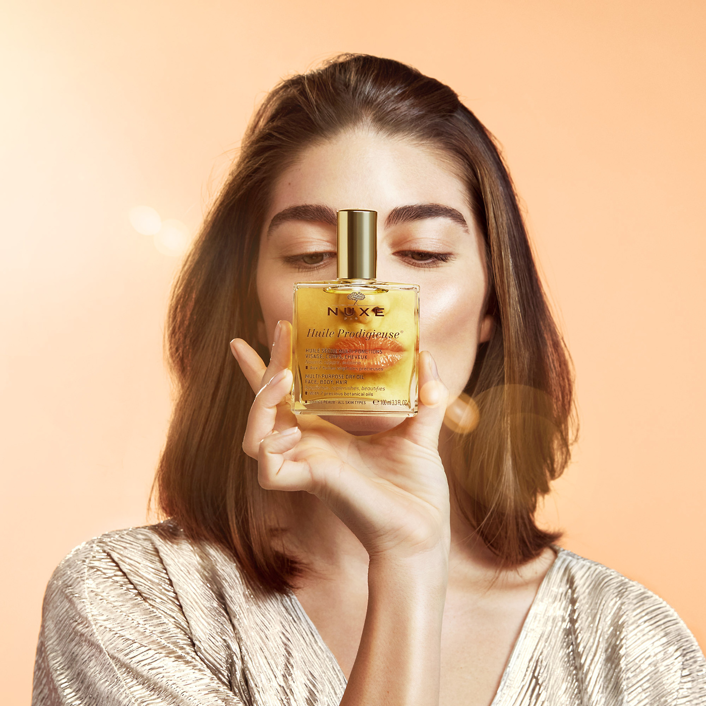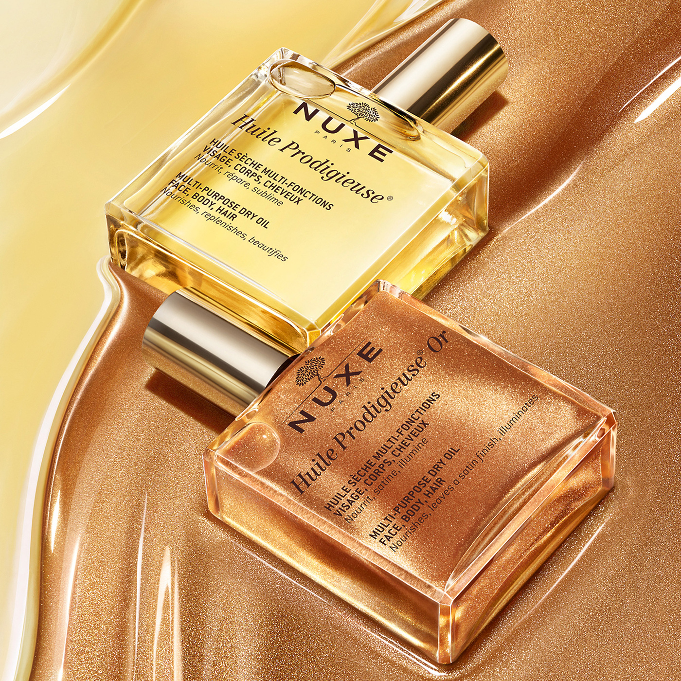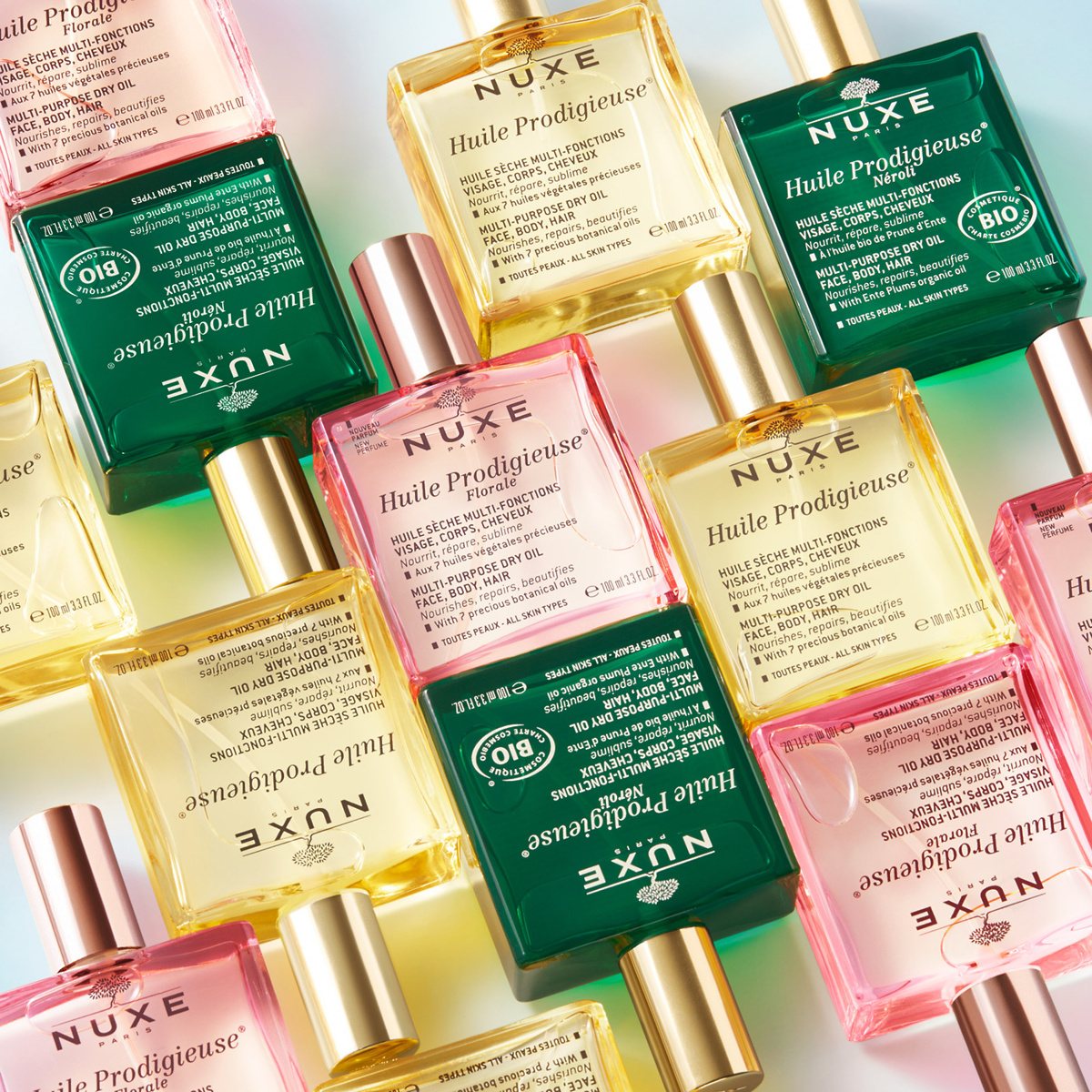 Nuxe-ova suha olja Huile Prodigieuse predstavljajo vse to, kar ženska je, torej ženstvenost, čutnost, romantiko in ljubezen. Prvo suho olje je nastalo davnega leta 1991 in sicer v času, ko je ustanoviteljica Laboratorija NUXE pričakovala svojega prvega otroka. Kot mlada mamica in podjetnica z zelo omejenim prostim časom je zasnovala ta čudežni izdelek vse v enem, kreiran za vse sodobne ženske, ki iščejo enostaven in učinkovit negovalen izdelek za telo, obraz in lase.