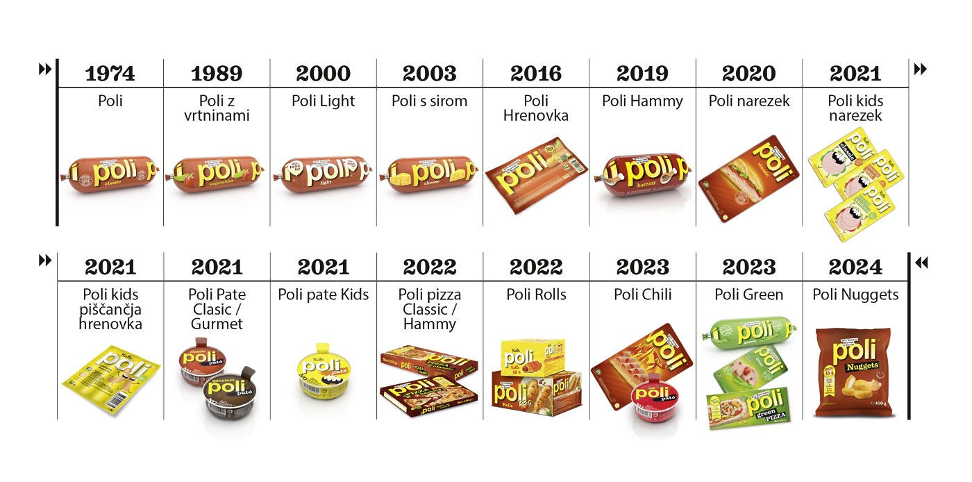 Poli je prerasla sinonim piščančje posebne klobase št.1 v Evropi in je ustvarila družino priljubljenih izdelkov, s katerimi je osvojila številna srca ljubiteljev po vsem svetu - od Skandinavije do Sredozemlja, od ZDA do Združenih Arabskih Emiratov. V skladu z razvojno strategijo je Poli vstopila v številne nove kategorije: od piščančjih posebnih klobas Poli, do hrenovk (od leta 2016), šunk in šunkaric z izdelki Poli hammy (leta 2018), otroške linije Poli kids z zmanjšano vsebnostjo soli (leta 2021), paštet Poli pate (leta 2021), do t.i. convenience programa z izdelki Poli rolls in Poli pizza (leta 2022) in linije Poli green (leta 2023), s katero nagovarjajo tudi vse tiste, ki iz kakršnih koli razlogov iščejo kvalitetne in okusne alternativne vire beljakovin. Novost v letošnjem letu je izdelek Poli nuggets.