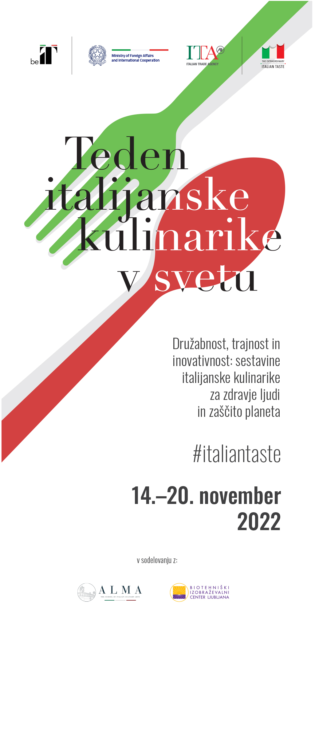 Tudi letos se v Sloveniji odvija Teden italijanske kulinarike, in sicer že sedmič zapovrstjo. Projekt stremi k predstavitvi kakovostnih italijanskih prehrambnih izdelkov v tujini, pri čemer sledi pozitivnemu trendu sektorja. Prizadeva si, da bi se tuji potrošniki v izogib pojavu Italian Sounding seznanili z uporabo pristnih in kakovostnih sestavin. Letošnja tema je "Družabnost, trajnost in inovativnost: sestavine italijanske kulinarike za zdravje ljudi in zaščito planeta". Cilj, ki ga je predlagalo italijansko Ministrstvo za zunanje zadeve in mednarodno sodelovanje, je torej ponovni zagon podobe Made in Italy prek povabila k oživeli družabnosti, ki s poudarkom na trajnosti in inovativnosti izdelkov spodbuja uživanje italijanske hrane in ob tem podpira in vzpodbuja proizvodna podjetja.