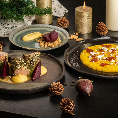 Chef Bruno Šulman priporoča, da za predjed postrežete milansko rižoto s pršutom in feto, v glavni jedi naj kraljuje svinjska ribica v bučnih semenih s kremno polento in popečeno peso, za popoln zaključek večerje pa bo poskrbela sladica – poširana hruška z vaniljevo kremo in drobljencem.