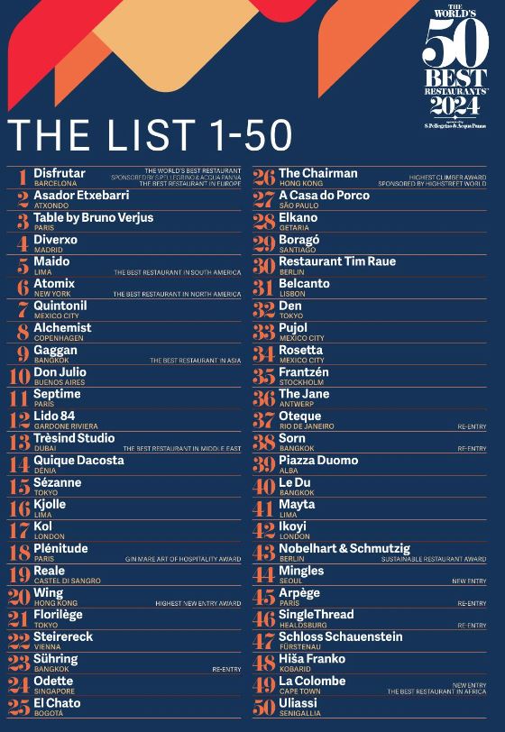 Tradicionalni izbor 50 najboljših restavracij na svetu »The World's 50 Best Restaurants 2024« potek že od leta 2002 pod pokroviteljstvom italijanske vode S.Pellegrino & Acqua Panna.