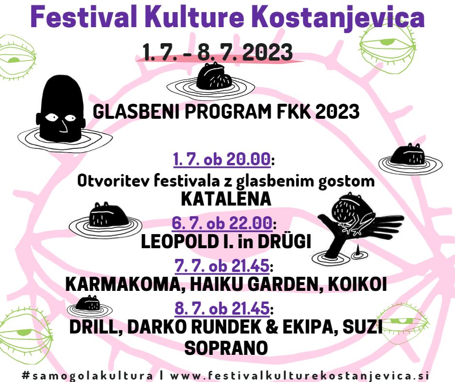 FKK 2023 bo v soboto, 1. julija ob 20. uri otvorila priljubljena skupina Katalena, ki bo s svojo vedno izvirno odrsko prezenco poskrbela za pravo glasbeno poslastico. Sledil bo pester preplet dogodkov, od gledaliških, glasbenih in filmskih, do razstave vizualne umetnosti, delavnic, okrogle mize in literarnega zajtrka. Ljubitelji glasbe bodo uživali tudi v nastopu družbenokritičnega raperja Leopolda I. v spremstvu štiričlanske zasedbe Drügi, izpostavljamo pa tudi nastop Drilla, vsestranskega raperja in ustvarjalca iz Izole. Ščepec ostrine bo dodal eklektični post punk trio Suzi soprano (Krško), za malo nostalgije bo poskrbel legendarni hrvaški roker Darko Rundek z Ekipo. Na odru se bodo zvrstili tudi pionirji slovenskega shoegaza Haiku Garden, pridih surovega roka in elektronike bo prinesla lokalna Karmakoma, z nami pa bo tudi ena najbolj vročih zasedb indie scene iz bivše Jugoslavije, KOIKOI.
