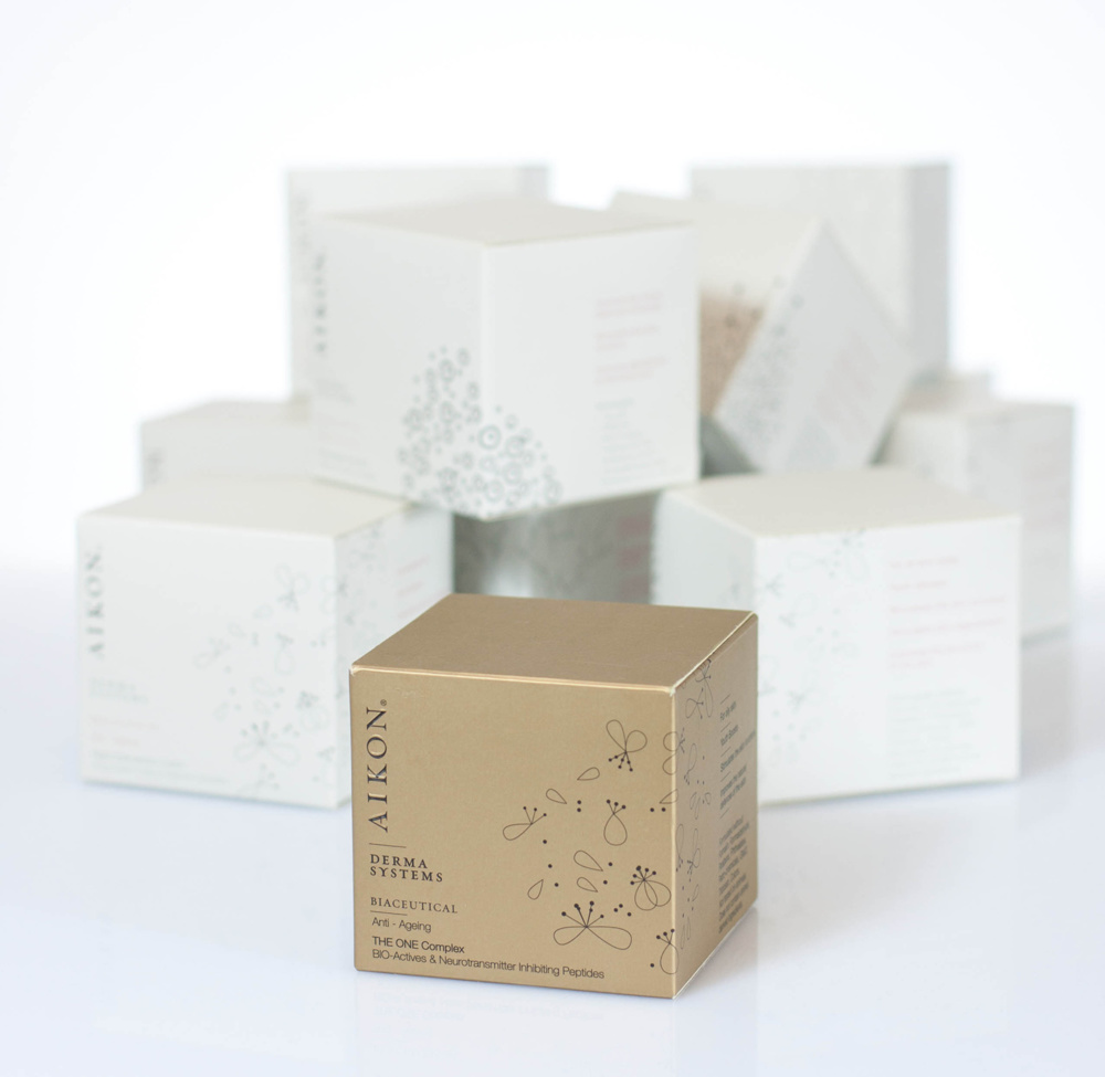Ime blagovne znamke Aikon izhaja iz navdiha ikonografske lepote gejš in v japonščini pomeni ikona. Minimalistična zunanja podoba odraža načelo formuliranja izdelkov: skrbno izbrane učinkovine s klinično dokazanim delovanjem v maksimalnih koncentracijah, brez odvečnih sestavin.