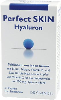 Prehransko dopolnilo Perfect Skin Hyaluron vsebuje izbrane in uravnotežene vitalne snovi kot so vitamini, minerali in hialuronska kislina, ki bodo pripomogli za zdravo in privlačno kožo tudi od znotraj. Hialuronska kislina je naravna sestavina kože in vezivnega tkiva. Približno 50% celotne količine hialuronske kisline najdemo v koži in vezivnem tkivu. V kozmetiki se uporablja kot vlažilno sredstvo, saj ima odlično sposobnost za vezavo vode. Uveljavila se je kot klasični kozmetični izdelek in postala nepogrešljiv del sodobne kozmetike za nego kože. Prehransko dopolnilo Perfect Skin Hyaluron vsebuje kombinacijo mikrohranil in kar 100 mg hialuronske kisline. Vitamini biotin, niacin in vitamin B2 ter mikroelement cink prispevajo k ohranjanju lepe in zdrave kože, las in nohtov. Baker prispeva k normalni obarvanosti kože, vitamin C pa ima vlogo pri nastajanju kolagena za normalno delovanje kože. Hialuronska kislina, naravna sestavina kože in vezivnega tkiva, zaokrožuje sestavo prehranskega dopolnila Perfect Skin Hyaluron.