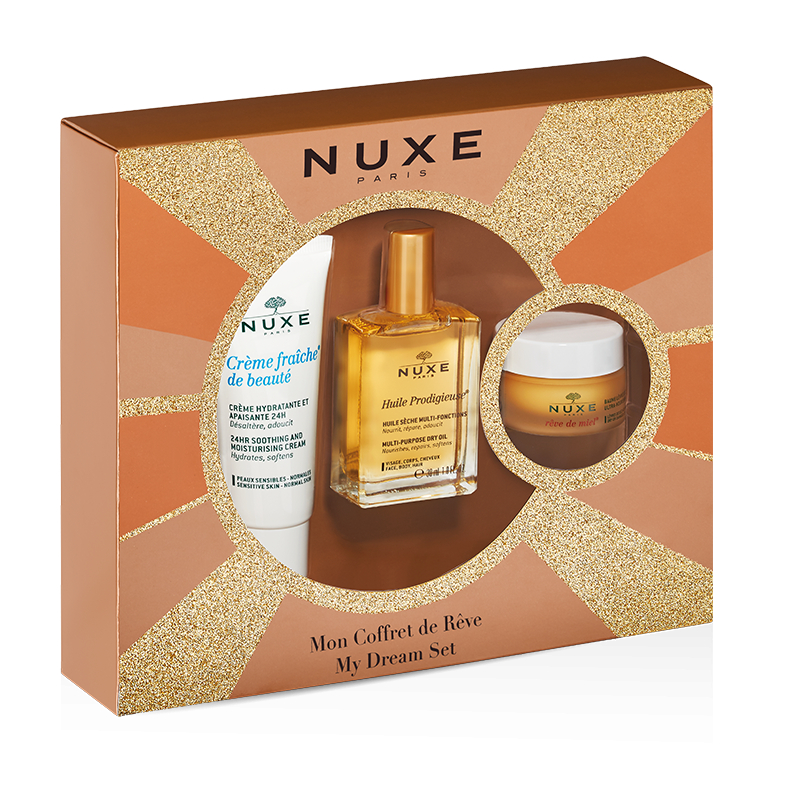 My dream darilni set pa vsebuje obilje medene nege, vlaženja in Čudežnih občutkov. Izjemno vlažilna in pomirjujoča Créme Fraîche® de Beauté krema (30 ml) je zimski 'MUST HAVE' za dehidrirano kožo, kultno Huile Prodigieuse® Čudežno suho olje (30 ml) razvaja naše telo, obraz in lase ter medene sanje naših ustnic, medeni Rêve de Miel® Izjemno hranilen balzam za ustnice, ki predstavlja piko na i slastni zimski negi.
