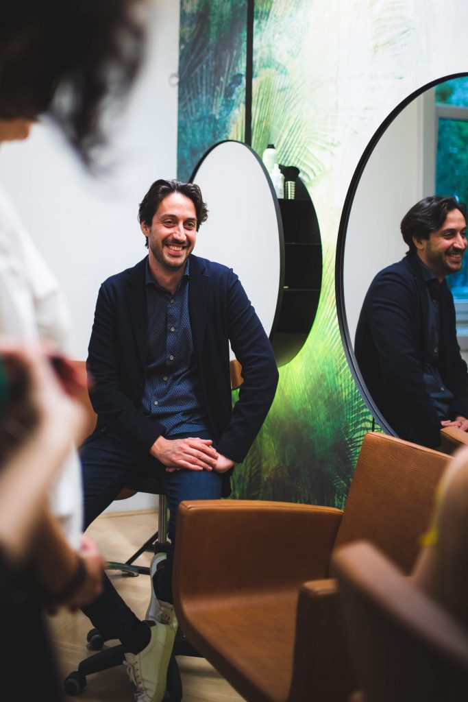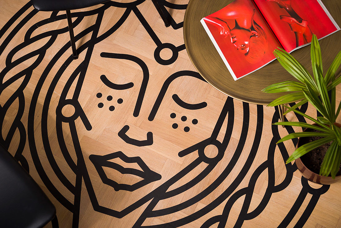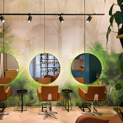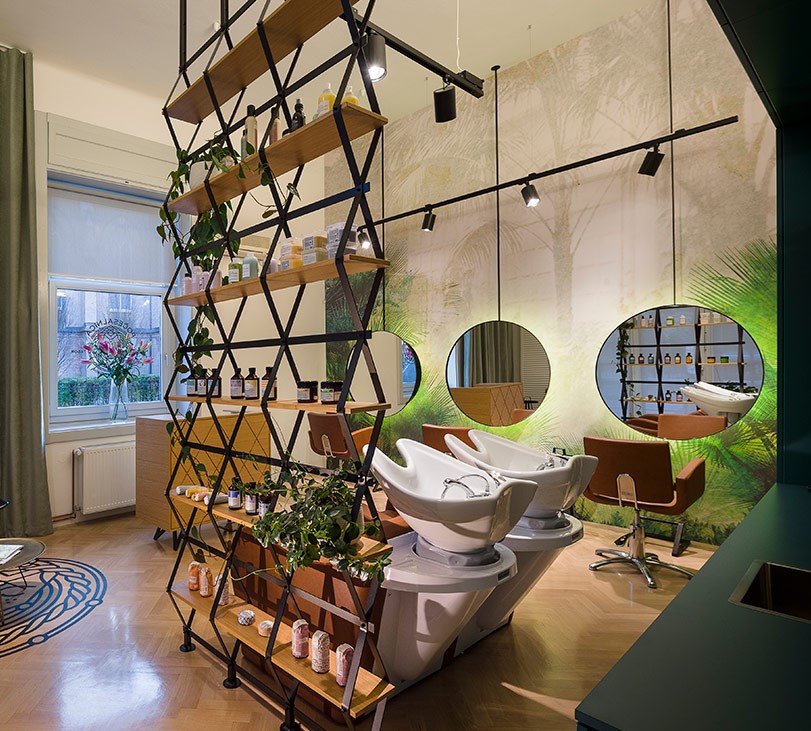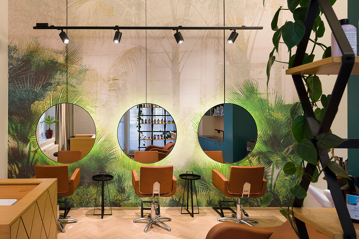 »Glavna elementa salona sta tapeta z bujnim tropskim zelenjem in netipični frizerski interier.«