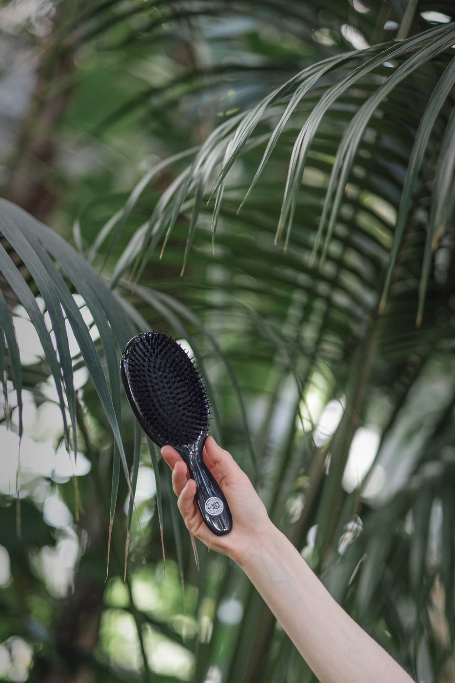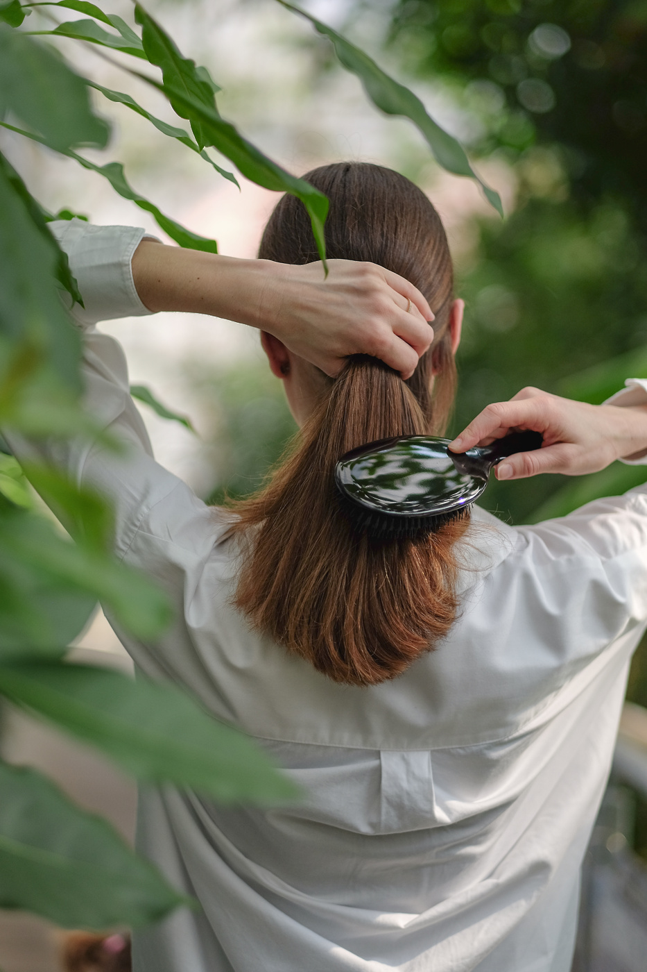 Krtača je tudi estetsko dovršena, sijočega črnega videza in z logotipom Počesalnice na ročaju. Redno česanje las je pomembno, saj s tem porazdelimo naravna olja od lasišča do konic in odstranimo lase, ki so pripravljeni na izpadanje, in s tem naredimo prostor za nove, sveže in sijoče lase. Česanje las pomaga pri ohranjanju zdravja lasišča in lasnih mešičkov. S česanjem las s krtačo nežno prehajamo čez lasišče in spodbujamo pretok krvi. Ob redni uporabi krtače za lase se na ščetinah nabirajo lasni prameni, ostanki izdelkov za lase in odmrle celice, ki so lahko odlično gojišče za bakterije. Pomembno je, da vsakih nekaj dni odstranimo lase, ki so se nabrali na ščetinah krtače, saj bomo z redno higiensko rutino prispevali k še bolj zdravim in sijočim lasem. V ta namen je Domen vsaki krtači dodal glavniček za čiščenje in žametno vrečko za shranjevanje.