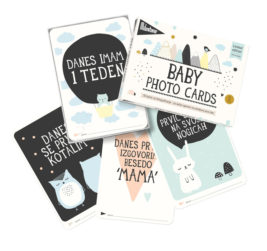 Dojenčkov prvi nasmeh, prvi koraki, prve besede. S 30 spominskimi foto karticami Milestone boste ustvarili spomine na pomembne mejnike vašega malega zaklada za vse življenje. Cena: 16,95 evra.