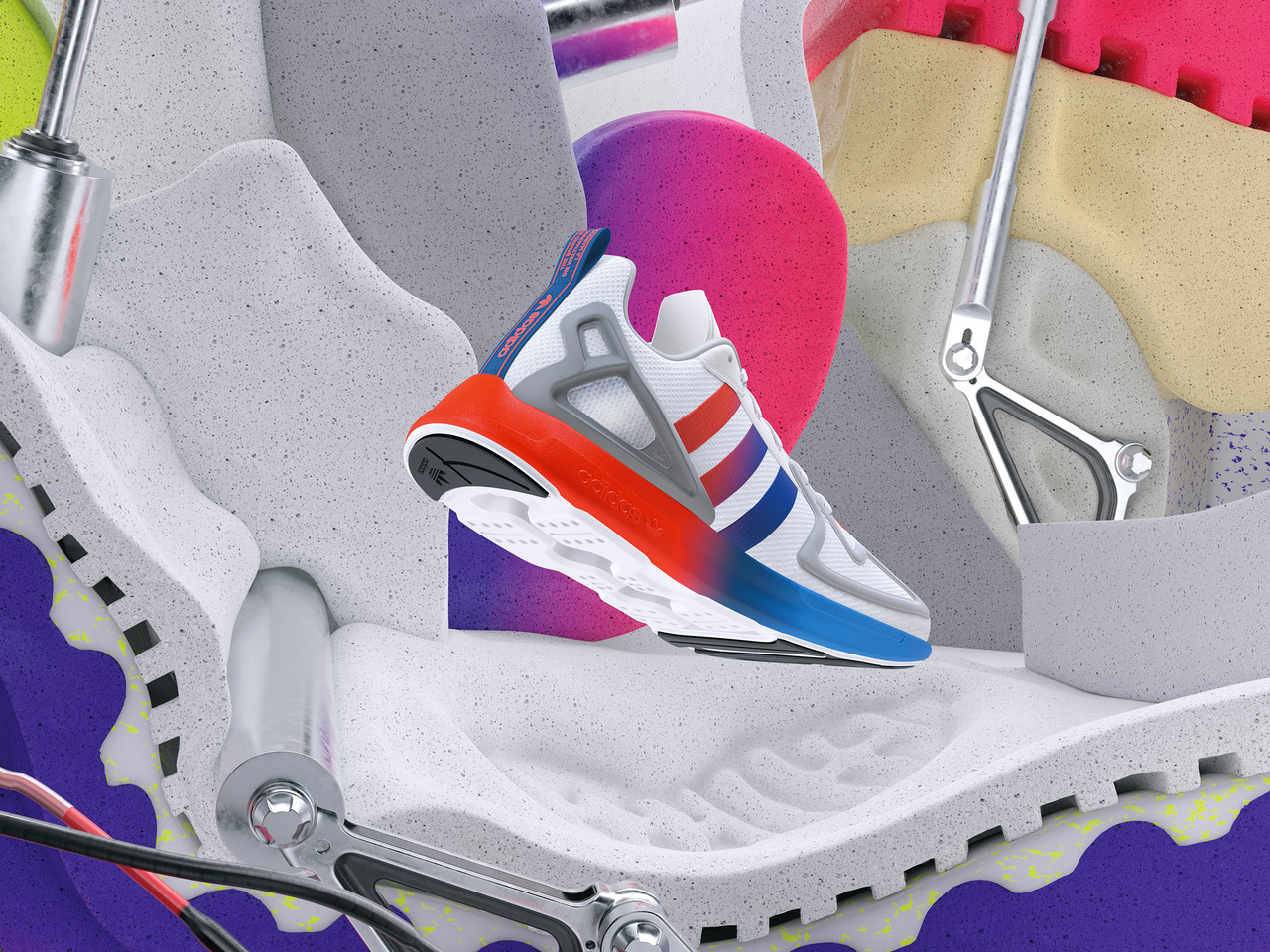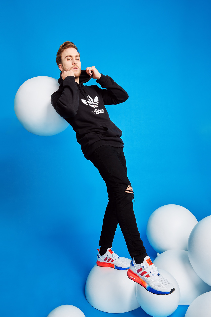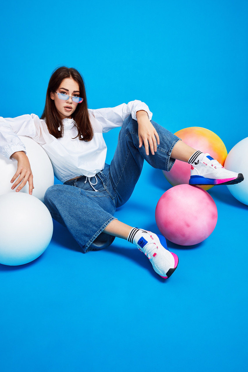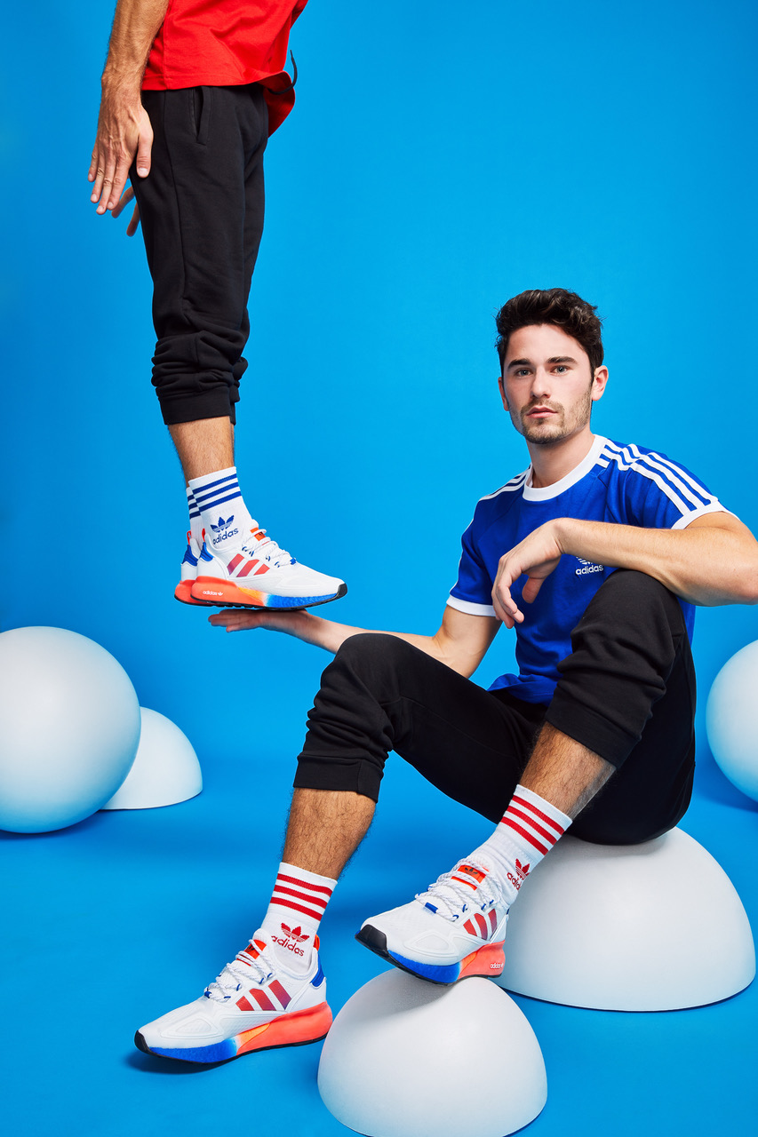 V jesenski sezoni adidas Originals prinaša ZX 2K BOOST v zanimivih ombre barvnih paletah. Ženski model ima bel mrežasti zgornji del z barvnim podplatom, ki se iz prstov prelije iz živo roza v modro barvo, podplat na moškem modelu pa iz modre v živo rdečo barvo.